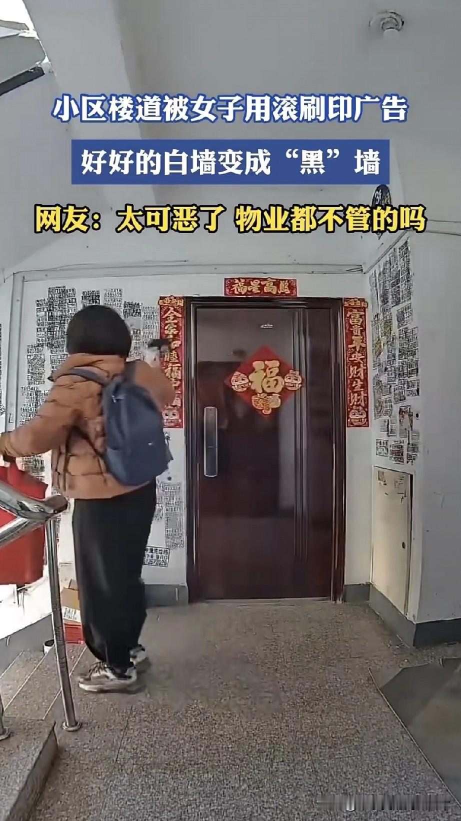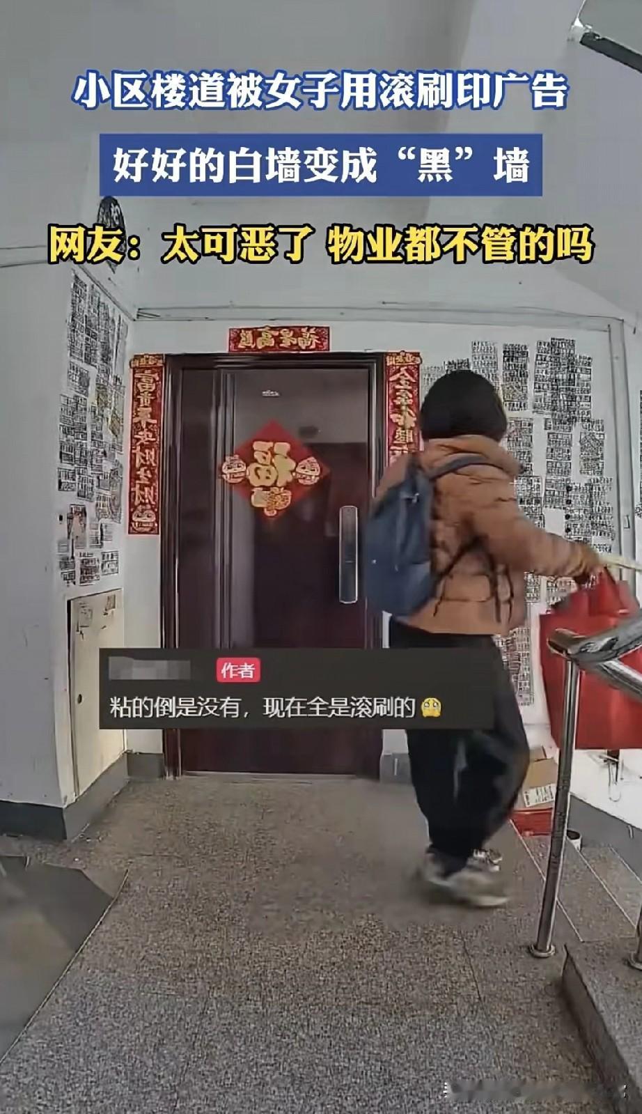 黑龙江女子拿滚刷“泼墨”楼道!白墙秒变“黑广告墙” 今早刷到个离谱视频:黑龙江一小区楼道里,一女子背着包、拎着桶,拿滚刷“唰唰”往白墙上印广告——好好的墙直接变成密密麻麻的“黑花脸”,连人家门口的春联都快被盖了! 这哪是发广告?分明是拿楼道当“涂鸦板”!以前见的小广告顶多是贴,现在直接上滚刷,洗都洗不掉,业主回家看着这堵“黑墙”,血压不得飙升? 评论区直接炸锅:“物业死哪去了?收着物业费当甩手掌柜?”“抓到让她把全楼墙刷白!”更气人的是有人说“报警都没用”——合着这种破坏公共环境的人,真就没辙了? 咱就说:物业不管,业主自认倒霉?还是这“滚刷式广告”,早晚得轮到你家楼道