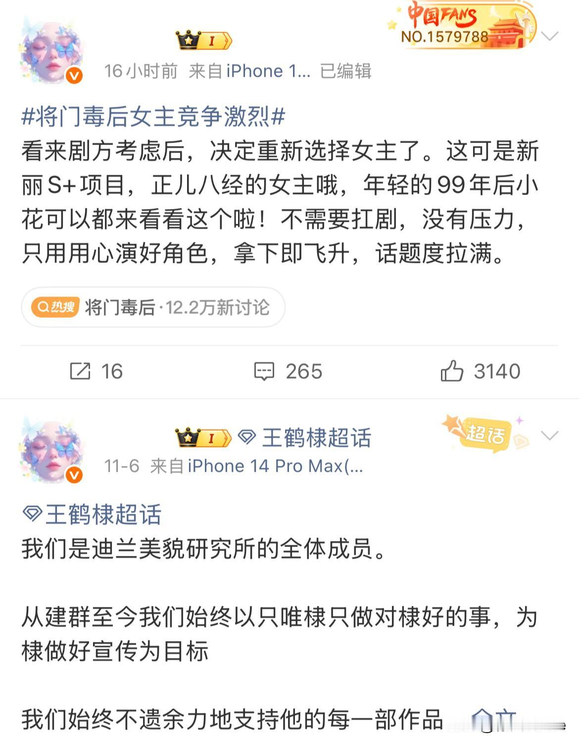 11月8日,《将门毒后》这个饼,孟子义先扔了,看到王鹤棣粉丝喊话小花来争女主,说