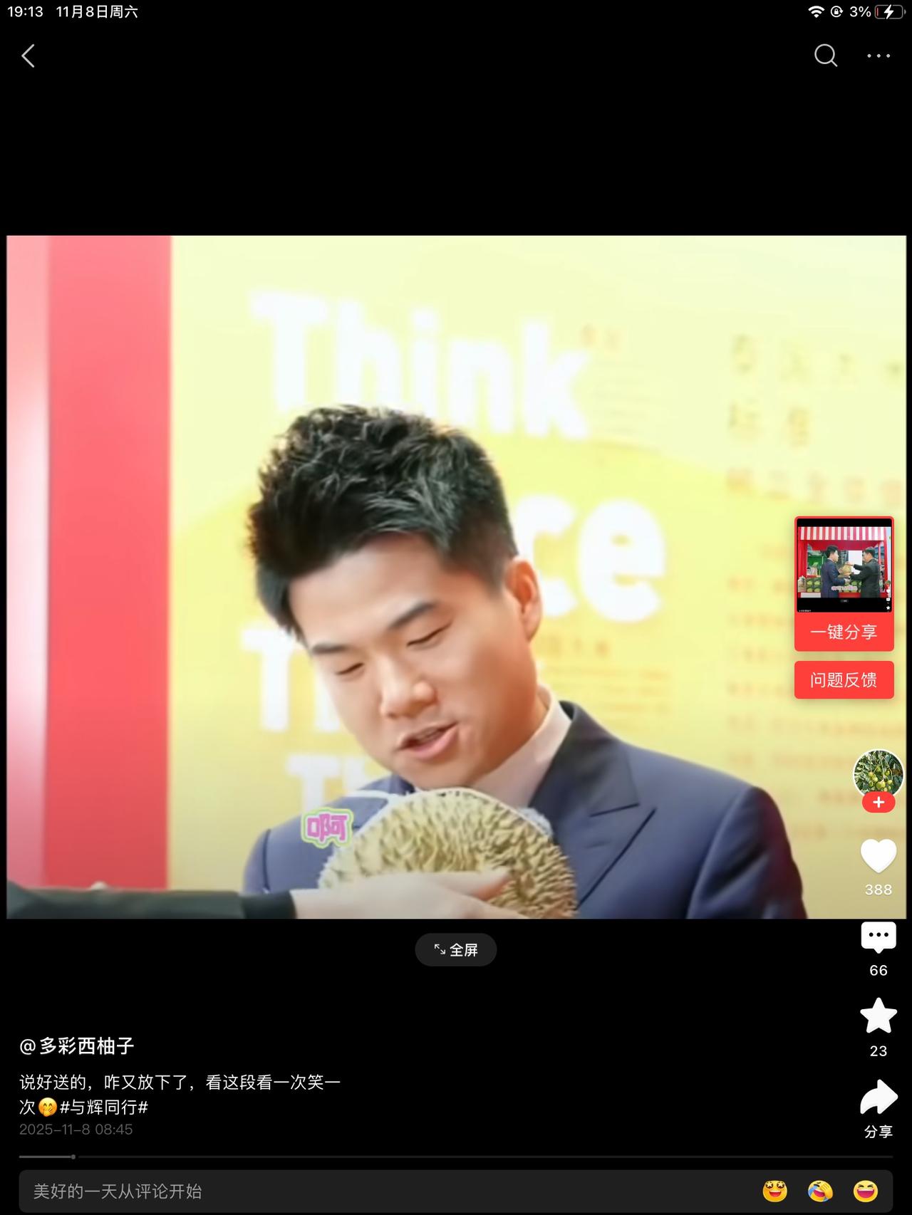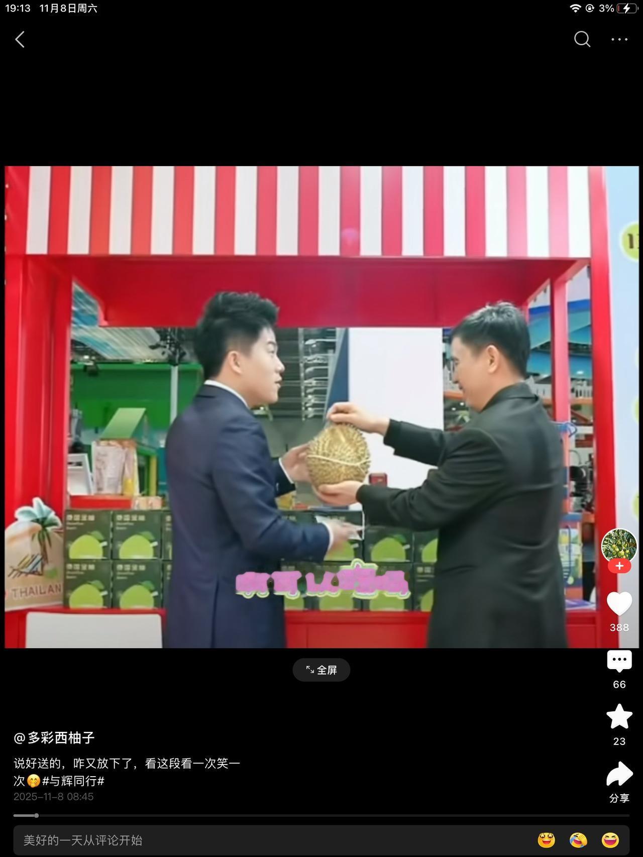 他是真爱吃榴莲啊!对方说送给他,可能是做节目不方便。说先放在那里。董宇辉说,又放下了!哈哈,流连忘返!接着又介绍柚子。 董宇辉一副欲言又止的样子。这一段太搞笑了!董宇辉一定是馋了,你想树熟的基本见不到。能吃到,又香,肯定很有诱惑。 节目一结束,人家就送去了。他说:不好意思,常来啊!人家说已经参加了八届了,他说,那我常来。 辉啊,你是冲着榴莲去的吗?哈哈树熟的,一定甜。就像烟台本地下了雪以后的富士苹果一样,香甜可口。
