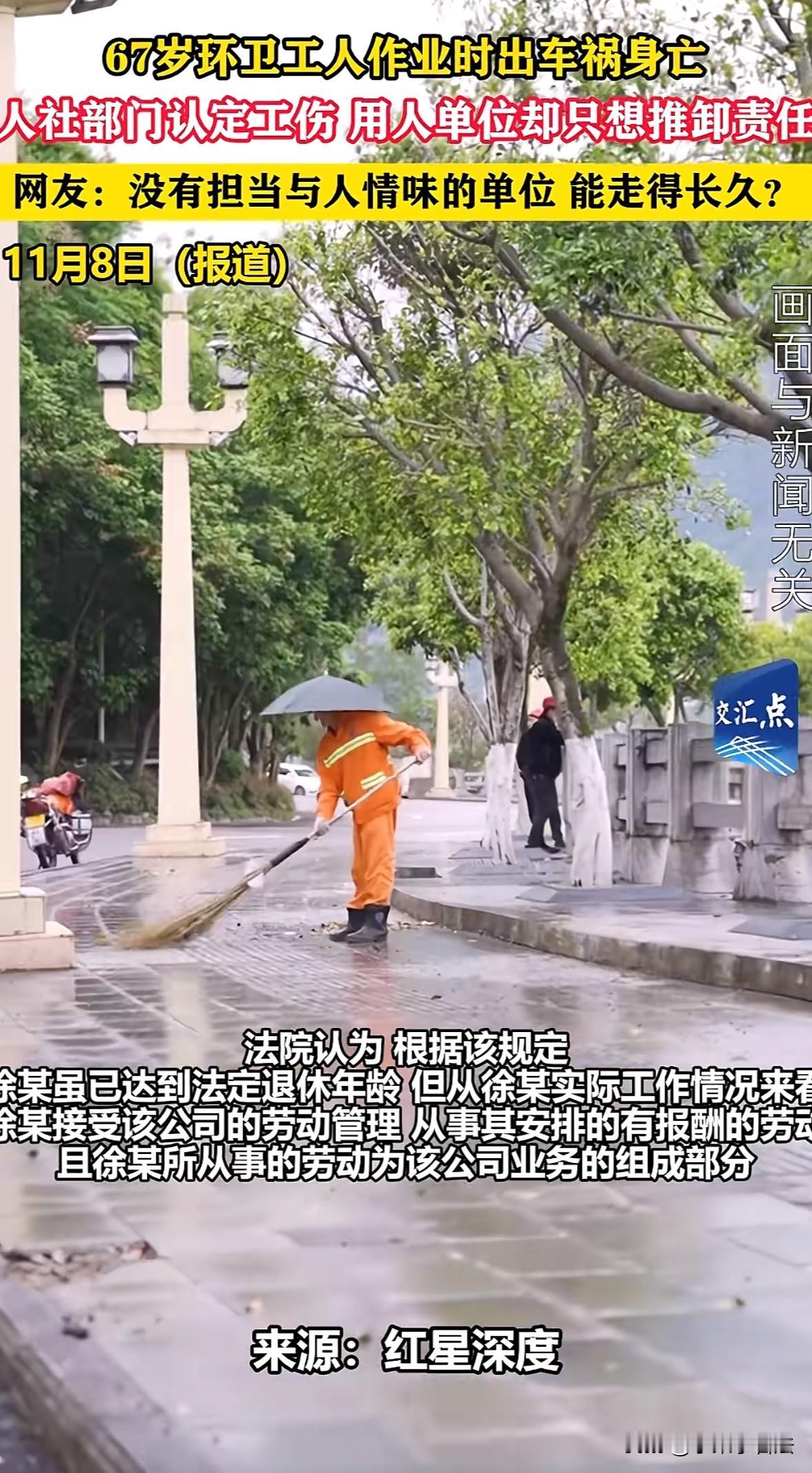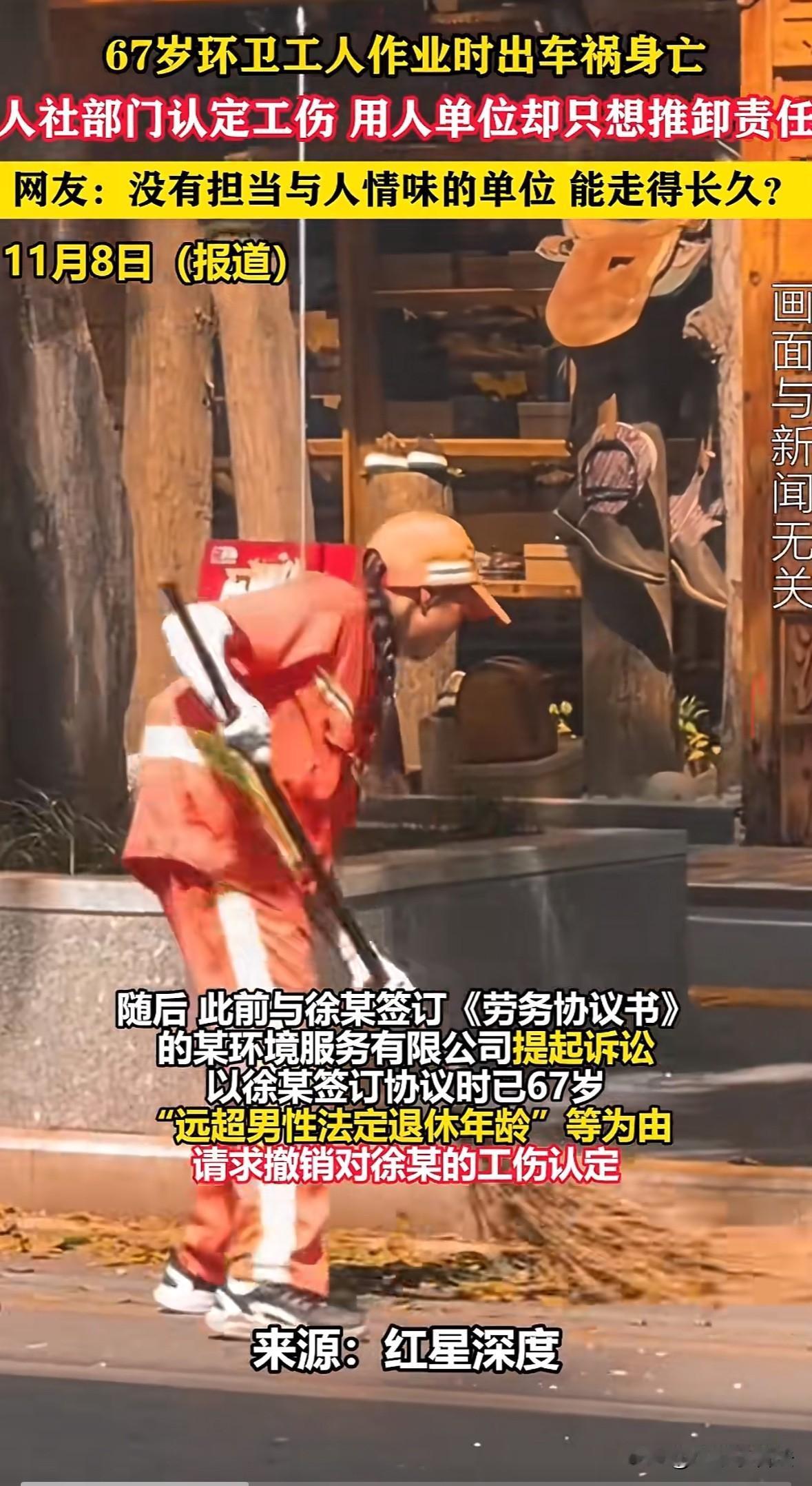 湖北随州,67岁环卫工人在工作时间被车撞倒,后经抢救无效死亡,人社部门认定环卫工人属于工伤。但是环卫工人所在的公司却不服,起诉要求撤销对环卫工人的工伤认定,理由是环卫工人签订劳务协议时已经远超退休年龄,法院判决引发热议。 为家里操劳大半辈子的徐某,在67岁的时候还没能够退休安享晚年,甚至还奋斗在工作第一线,甚是辛劳。 徐某是8月17日和公司签订的劳务协议,当时签订协议时,徐某已经是67周岁。但是公司并未因徐某的年龄问题,在工作上有任何的变动,而是和其他人一样。 每个环卫工人都可以自己选择上班的时间段,徐某选择的是早上9:30-13:30,晚上5:30-9:30结束。 工作了4个月,徐某已经习惯了这样的工作强度。因工作的特殊性,他经常要穿梭在车流不息的马路中间,为此他很是小心,就怕发生意外。 在2024年12月的某天晚上7点多,徐某还奋斗在工作一线上,小心翼翼,但是工作一点也不敢松懈,即便是这样,还是发生了意外。 徐某在交通大道路段清扫路面时,被一辆小轿车撞伤,然后徐某就被送往医院抢救,但是于当天晚上10点半,徐某经抢救无效死亡。 交警部门作出道路交通事故认定,认定徐某在交通事故时,是在进行路面作业。 徐某的家属处理完后事,就找到人社部门,要求对徐某做出工伤认定。 根据《工伤保险条例》第14条的规定:职工有下列情形之一的,应当认定为工伤: (一)在工作时间和工作场所内,因工作原因受到事故伤害的; (二)工作时间前后在工作场所内,从事与工作有关的预备性或者收尾性工作受到事故伤害的; (三)在工作时间和工作场所内,因履行工作职责受到暴力等意外伤害的; (四)患职业病的; (五)因工外出期间,由于工作原因受到伤害或者发生事故下落不明的; (六)在上下班途中,受到机动车事故伤害的; (七)法律、行政法规规定应当认定为工伤的其他情形。 人社部门经过6个月的审核,认为徐某的情况符合第一款的规定,予以认定为工伤。 徐某家属将工伤认定结果拿回到公司后,却得出不一样的结论,公司不认可人社部门对徐某工伤的认定。 公司认为徐某在签订劳务合同的时候已经67周岁,早已经超过男性法定的退休年龄,并以此为理由进行起诉,要求撤销对徐某的工伤认定。 公司提供出徐某与公司签订的劳务协议,双方约定协议期限为2024年8月18日至2025年8月17日,徐某在该公司从事环卫工工作。 公司认为,徐某并不符合工伤认定的前提条件。 首先徐某签订劳务协议时已经67周岁,远超男性法定退休年龄,徐某不具备建立劳动关系的主体资格。其次徐某与公司签订的并非劳动合同,而是劳务协议。 公司认为与徐某并无劳动关系,因此公司无法给徐某缴纳工伤保险,所以人社部门认定徐某为工伤没有依据。 法院经过审理后认为: 公司与徐某签订的劳务协议情况属实,但徐某也的确是在工作期间被撞受伤不治身亡。 在工作时间内受到事故伤害,应该属于工伤认定的范围内。 根据《最高法行政审判庭关于超过法定退休年龄的进城务工农民因工伤亡的,应否适用〈工伤保险条例〉请示的答复》中规定: 用人单位聘用的超过法定退休年龄的务工农民,在工作时间内、因工作原因伤亡的,应当适用《工伤保险条例》的有关规定进行工伤认定。 公司提出徐某签订劳务协议时已经67周岁,超过法定退休年龄,无法缴纳工伤保险。 但是根据最高法对于超过法定退休年龄因工伤亡的答复中规定,徐某的情况适用于《工伤保险条例》的有关规定,可以认定为工伤。 根据《工伤保险条例》第2条的规定:中华人民共和国境内的企业、事业单位、社会团体、民办非企业单位、基金会、律师事务所、会计师事务所等组织的职工和个体工商户的雇工,均有依照本条例的规定享受工伤保险待遇的权利。 根据徐某的实际公司情况,徐某接受公司的劳动管理,且从事公司安排的劳动活动获取报酬,公司安排的劳动活动也属于公司业务的一部分。 虽然公司与徐某签订的劳务协议,但是徐某与公司存在的却是劳动关系,并非劳务关系,因此法院驳回公司要求撤销徐某工伤认定的诉求。