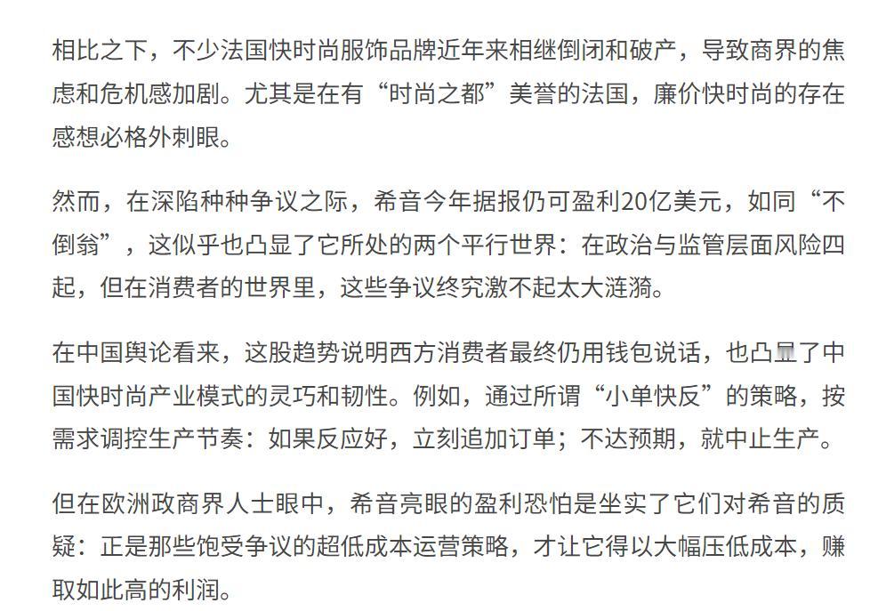 根据联合早报11月7日报道,即便是面临着美国欧洲的诸多打压,中国跨境快时尚巨头希音(Shein),在这样的情况下,竟然依旧实现了惊人的利润增长,比如说今年其盈利就预计高达20亿美元,比去年高出近一倍。 这个结果令联合早报感到震惊,因为希音这些年希音所面临的压力可谓是非常巨大。 首先是美国,从2025年5月开始,就直接终止了中国进入美国的小额包裹的免税待遇,在这之前希音之所以能够快速在美国市场崛起,就是因为美国这个独特的小额包裹免税政策,这个政策使得希音能够不缴纳关税,从而让自己的商品拥有非常便宜的价格,这个政策取消之后,希音售卖的商品,其价格都不得不上涨,按理来说,这对希音应该是一个重创。 其次是欧洲各国,希音除了进入美国市场之外,也进入了欧洲市场,而欧洲市场也对希音十分的抵制,之所以如此,是因为希音的发展速度实在是太快了,挤压了欧洲本土市场品牌的生存空间,比如说有着“时尚之都”称呼的巴黎,最近这段时间都已经有许多服饰品牌破产倒闭,但是希音却蒸蒸日上,市场份额不断提升,这使得欧洲市场也开始抵制希音。 而欧洲各国抵制希音的手段则是丰富多样,其主要是试图从舆论、监管上来打压希音,比如说法国相关机构,就经常以各种理由,比如说环保问题、服装质量不合格,等等,来调查希音,然后对希音罚款,罚款还不够,法国甚至还呼吁欧盟,对希音进行更加严格的调查。 可以说,任何一个企业,面对这样的压力,恐怕都难以继续发展下去了,不过希音却是不同,即便是面临了这么多“非市场”的压力,它依旧顽强的在欧美市场扎根了,而且还发展得越来越红火。 之所以如此,联合早报分析,最根本的原因,还是希音这个商业模式,的确是对欧美本土服饰品牌的一种降维打击,因为希音的商品,普遍价格比较便宜,同时更新迭代也很快,一个老牌的服装品牌,比如说zara,一年可能也就上新一两万款新品,但是希音不同,希音通过其独特的“小单快反”的模式,一年能够上新超过100万的新品! 这个效率,传统服装品牌,如何能比? 快时尚的服饰品牌,看的就是上新速度,看的就是谁能够更迅速的把握住流行趋势,而一个一年上新一两万款新品,一个一年上新超过100万款的芯片,这两者之间是十倍以上的差距! 因此,现在希音可以说是发展得越来越红火了,即便是欧美采用各种手段打压,基本上也起不到任何用处,希音非但没有受到影响,利润还在逆势上涨! 曾几何时,在服饰鞋类等品牌方面,欧美往往都是占据着绝对的优势,谁能想到,现在我们在这方面,不仅追赶上来了,而且还打入了欧美本土市场,发展得如火如荼。 这个其实也是我们的文化软实力不断提升的一个表现! 经济科技的发展,带来了商业模式的更新,商业模式的更新,则是对欧美传统的服饰品牌,形成降维打击,这是一次酣畅淋漓的文化超车!