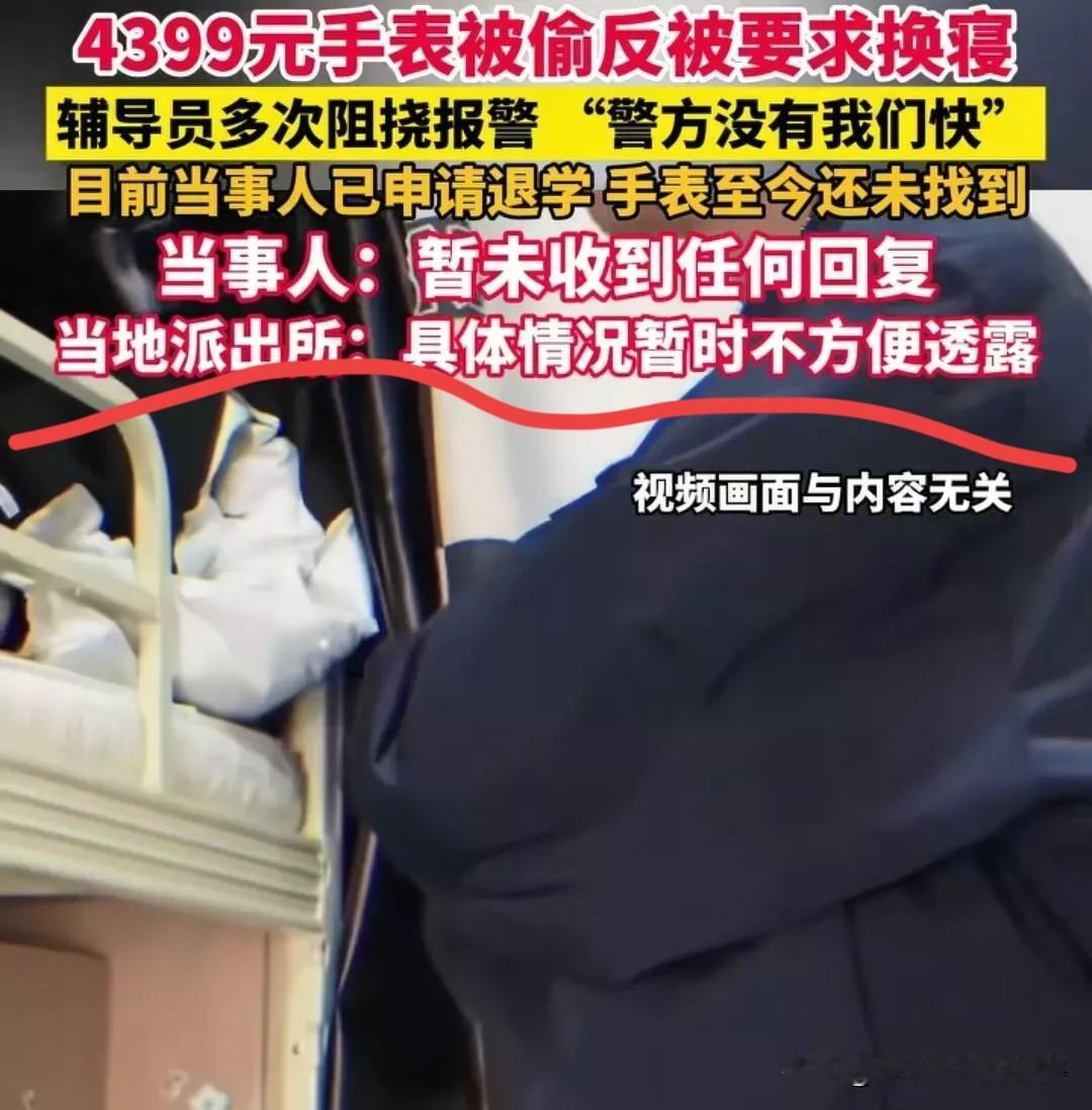 4399元手表被偷反遭退学?上海建桥学院这波操作太离谱! 谁能想到, 学生丢了贵重手表维权,最后竟被逼到退学?上海建桥学院这事儿真的刷新认知!刚入学没多久的女生,4399元的手表莫名失踪,定位直指新舍友床铺,正常报警却被辅导员百般阻拦,甚至还被电话质问。 更让人愤怒的是,后来才知道这位舍友本就是因多次盗窃才调过来的,校方早已知情却刻意隐瞒。女生要求嫌疑舍友搬离,辅导员反倒断水断电撵人,连女生母亲都被驱赶,最后忍无可忍退学,还被校方扣了五千多元,手表至今下落不明。 这哪里是教书育人的学校?分明是在纵容恶行、寒了受害者的心!辅导员的偏袒让人费解,校方的处理方式更是离谱,保护盗窃者、打压维权学生,这样的校园环境谁能安心? 学校的底线不该是纵容错误,教育的初衷更该是明辨是非。这件事你怎么看?是辅导员私心作祟还是校方管理失职?欢迎在评论区聊聊你的观点!