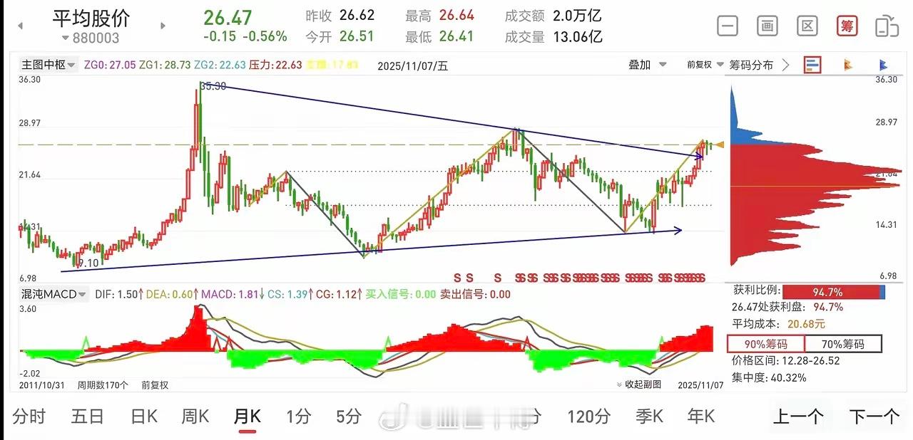平均股价月线同样突破了长期下降趋势线,上行趋势得以确立。若非高手,通常无需频繁操作,持股待涨即可。即便追高后被套20 - 30%,也不必割肉。在牛市行情里,下跌皆是机会,这波行情自会助你解套。