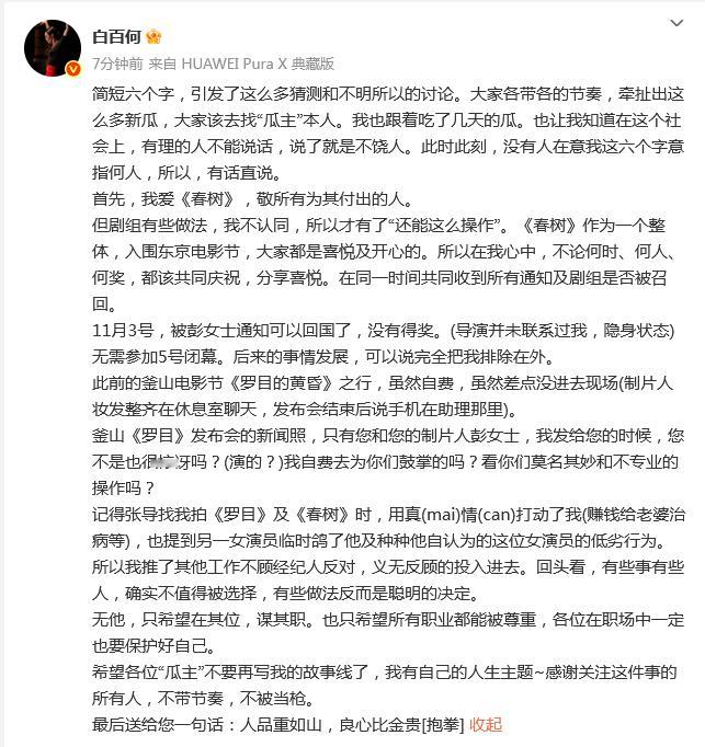 春树导演制片人回应争议张律否认靠卖惨打动白百何 谈及白百何长文提及的“被排除在外