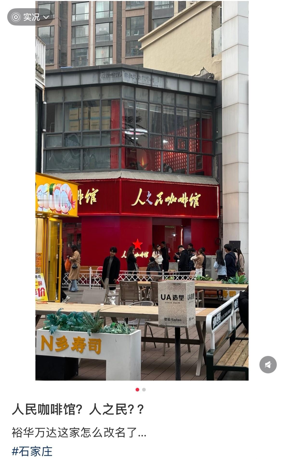 人民网评人民咖啡馆不妥 一个咖啡馆用人民这两个字确实不妥,这两个字可是非常庄重和带有民族情感的。这可不是什么国潮,不管如何,红线不能踩。[并不简单][并不简单]据说他们已经连夜改成了人之民咖啡馆?心虚了吧!