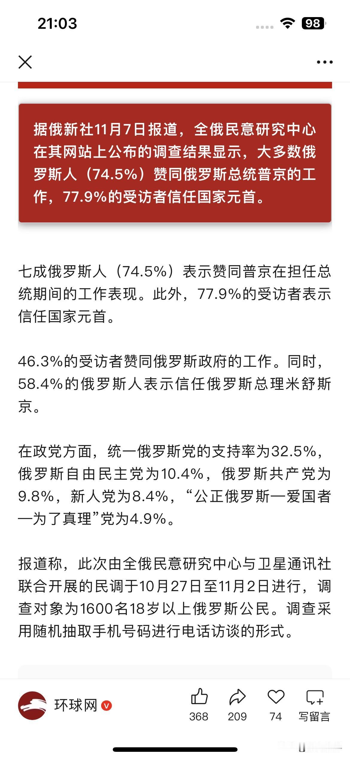 俄罗斯普京最新支持率 据俄新社11月7日报道,全俄民意研究中心在其网站上公布的调查结果显示,大多数俄罗斯人(74.5%)赞同俄罗斯总统普京的工作,77.9%的受访者信任国家元首。