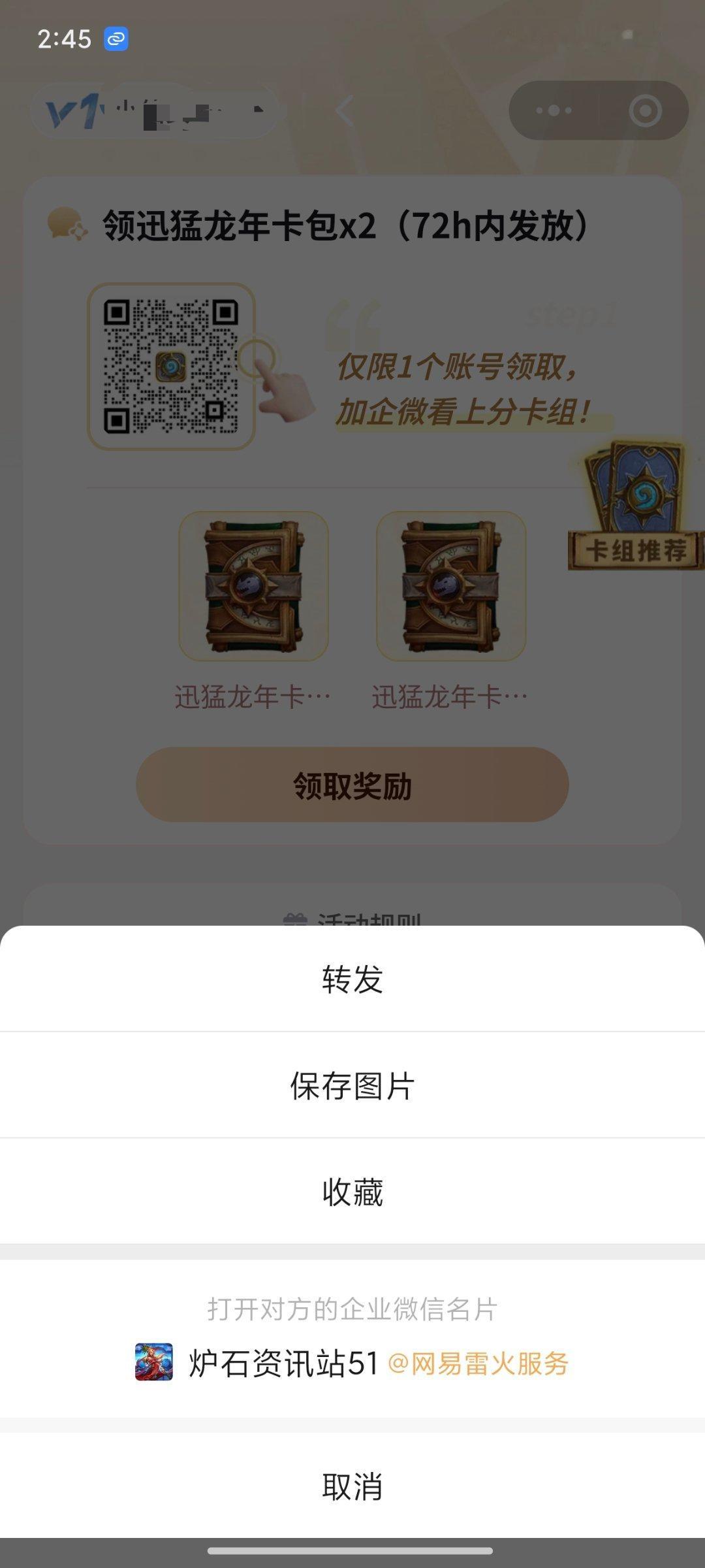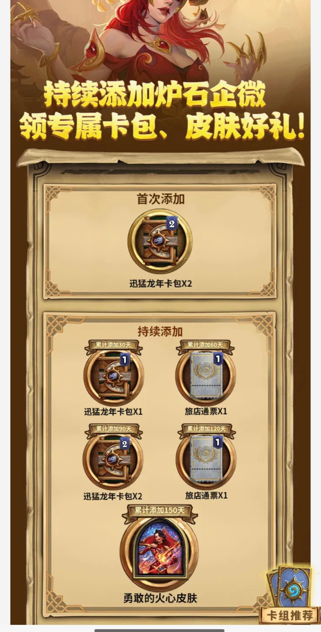 炉石传说 还有一个变态的活动,添加炉石微企,在小程序网易超级会员那。首次添加可以领2个迅猛龙年卡包,不过之前领过关注福利不能再领,而且关注150天就能领1个皮肤![doge]