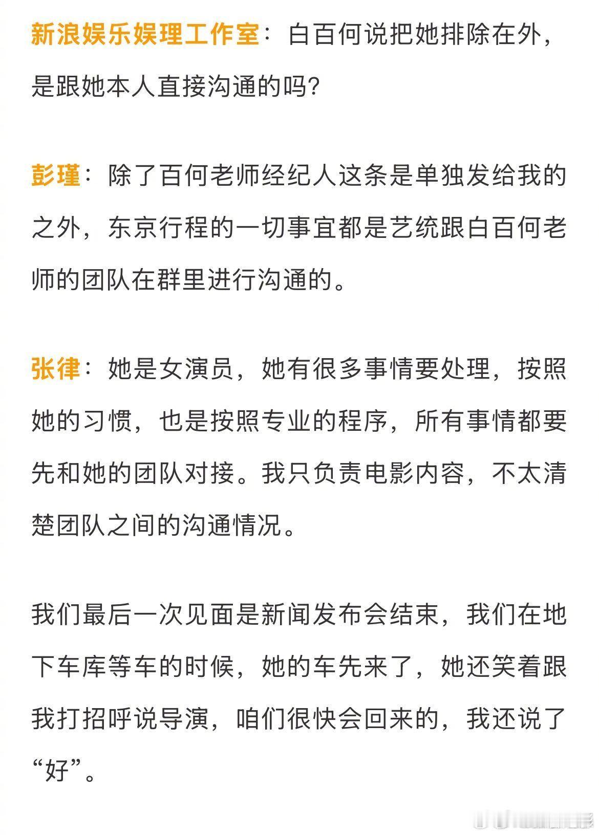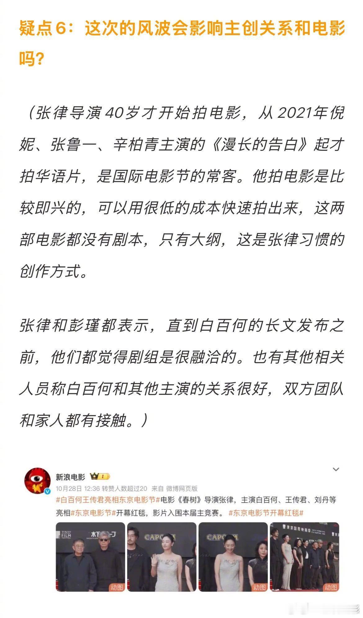张律和彭瑾都表示,直到白百何的长文发布之前,他们都觉得剧组是很融洽的