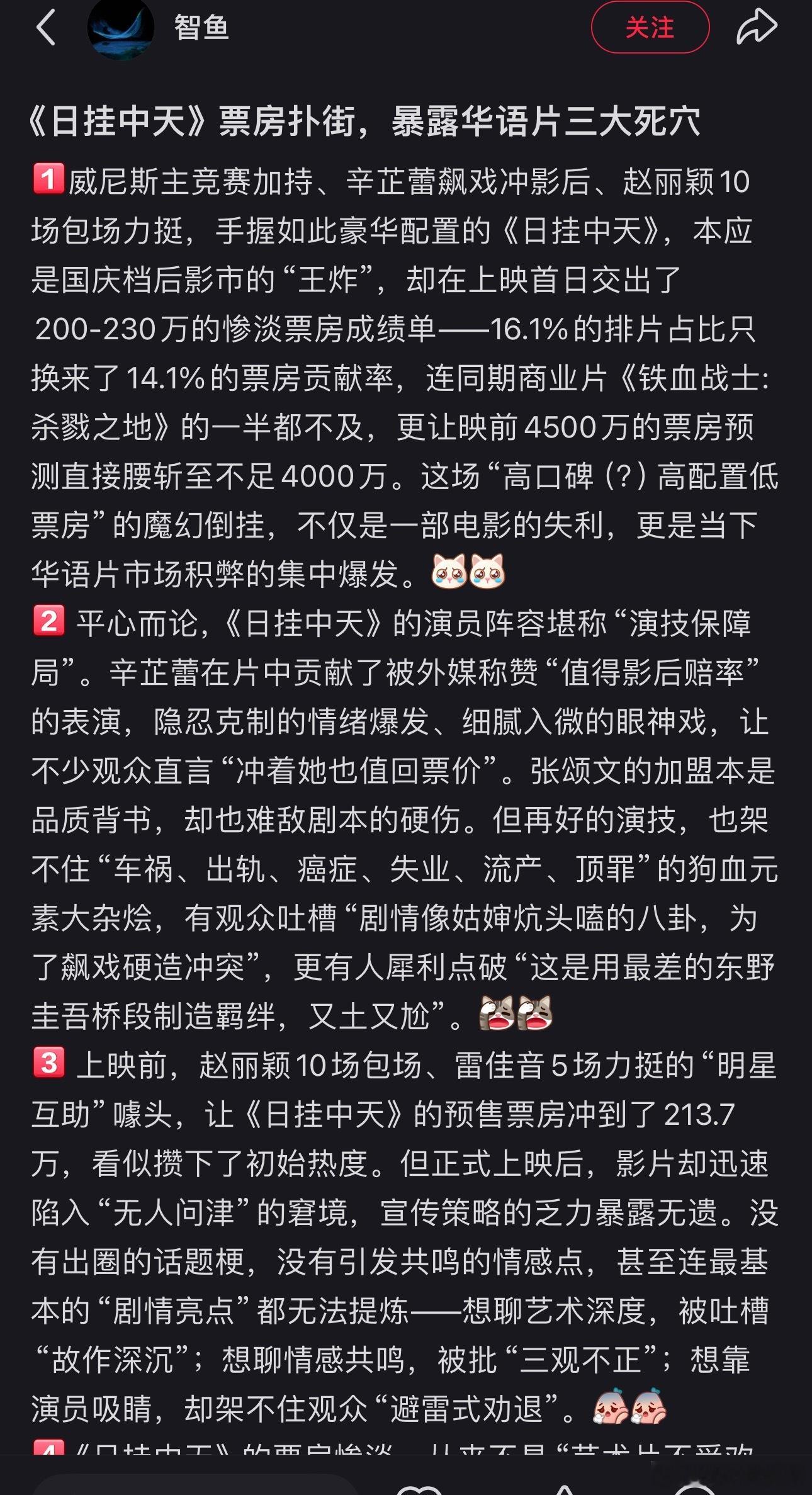 日掛中天票房倒挂 大花 亲自下场辛芷蕾演技疑似郝蕾朋友圈发文有博主总结《日挂中天》票房扑街,暴露华语片三大死穴!网友做出了解答:
