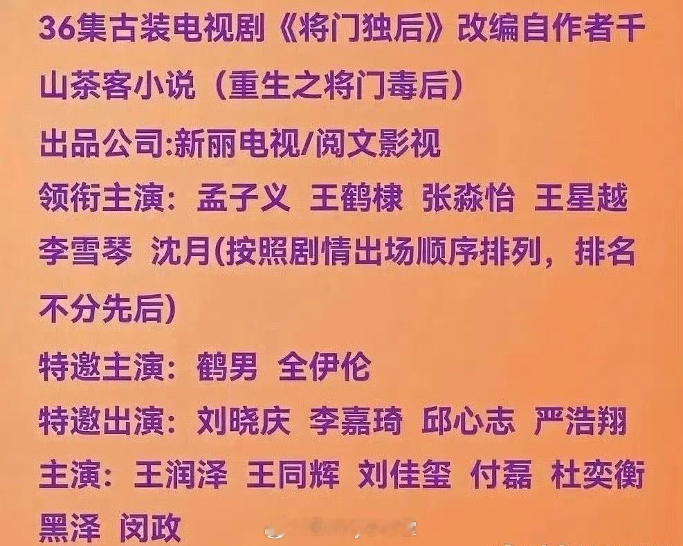 网传《将门独后》完整阵容,主演有孟子义、王鹤棣、张淼怡、王星越、李雪琴、沈月等,真要来啦[老师好]