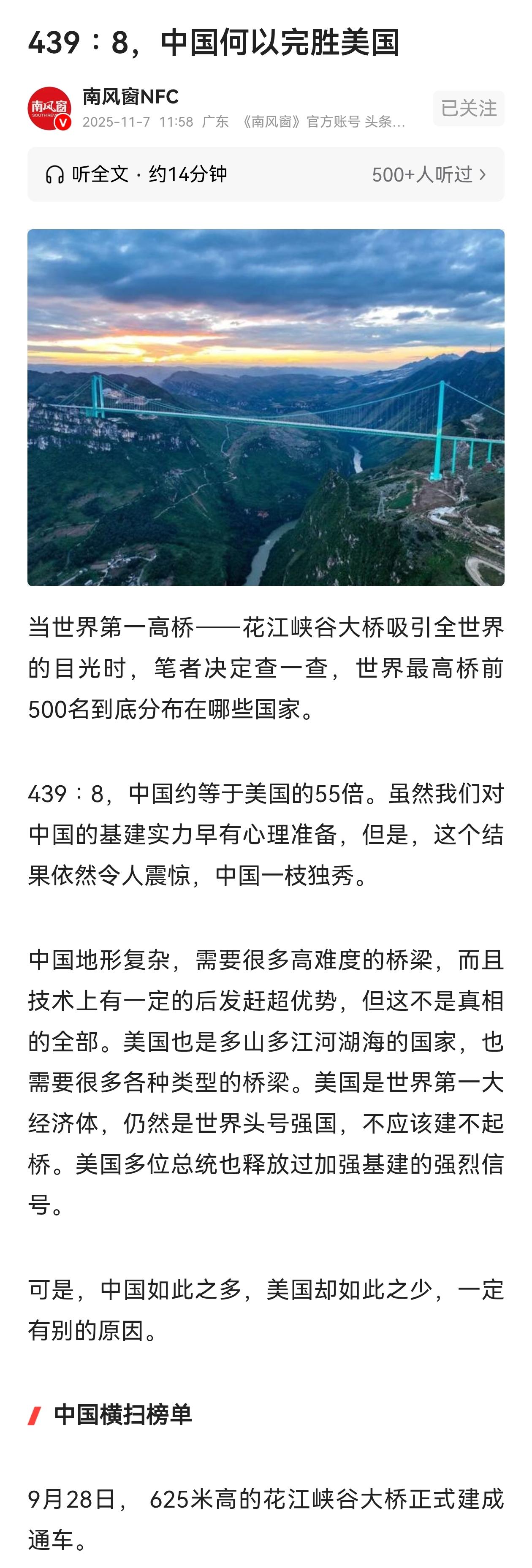 世界最高桥前500名中国占87.8%,数量达439座,而美国只有8座,中国一骑绝尘,遥遥领先。400米、500米、600米以上高度的17座桥梁全部来自中国。这两天因为美国政府停摆,导航员发不出薪水,美航班数量减少了百分之十,继续发下去会减少百分之二十。如果说美国有钱人不用桥梁只坐飞机,飞机也少了,你会说美国有钱人只坐私人飞机。对了,美国说白了是为坐私人飞机或者空军一号的人的私利服务的。