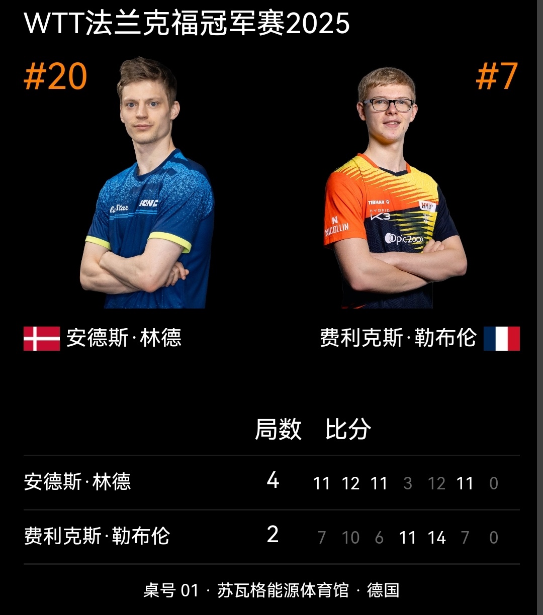 林德4比2菲利克斯勒布伦(11-7,12-10,11-6,3-11,12-14,11-7)