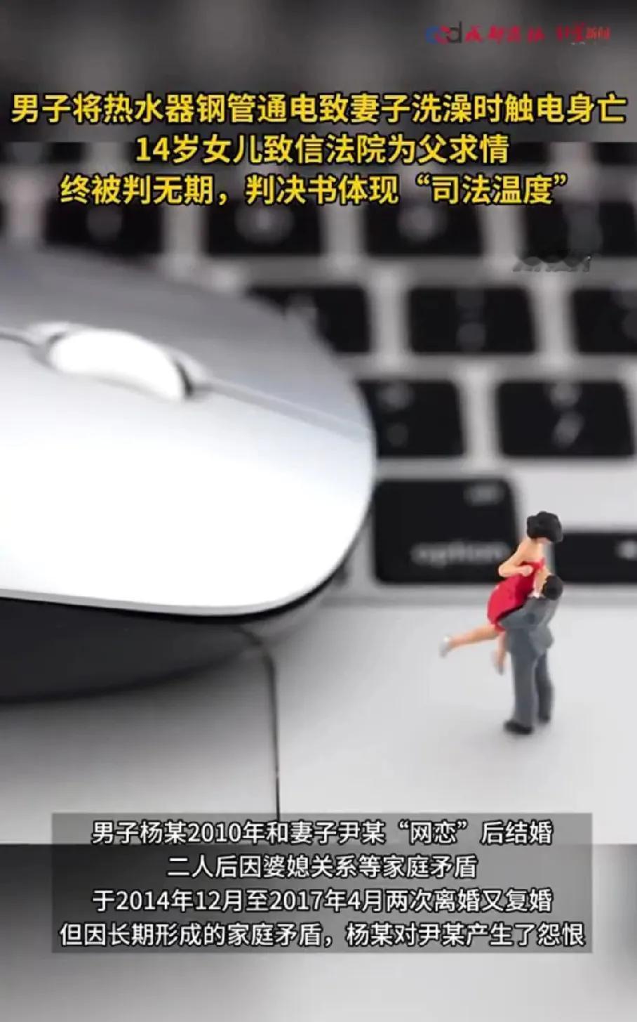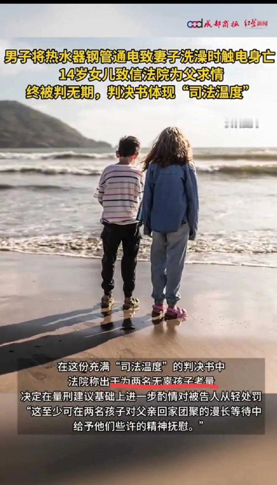 男子因怀疑妻子外遇,婆媳纠纷等矛盾,故意将热水器通电致其触电身亡。法院一审判决为无期,其原因是出于孩子考量,司法的温度难道不应该给无辜的人吗? 14岁女儿致信法院,称父亲“日常表现良好”,请求轻判以实现家庭团聚。按理说女儿应该共情母亲的,母亲都被父亲杀了,还主动请求,这信的可信程度存疑。 一个父亲杀母亲的时候,没有考虑到孩子,难道出狱了就会考虑到孩子的感受? 父亲无期徒刑,表现良好,减减刑,正好可以赶上女儿中年赚钱,正好让女儿养老。 这温情倒是温暖了凶手的心,希望他能在狱期间多想想,体弱多病的父母,幼小丧母的儿女,出狱后能善待他们。