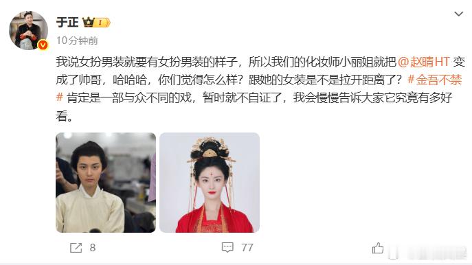 于正注重女扮男装的角色适配性,赵晴在《金吾不禁》中以造型响应,利落装扮搭配贴合角色的神态,传递出对创作的严谨态度。于正女扮男装就要有女扮男装的样子赵晴金吾不禁女扮男装造型