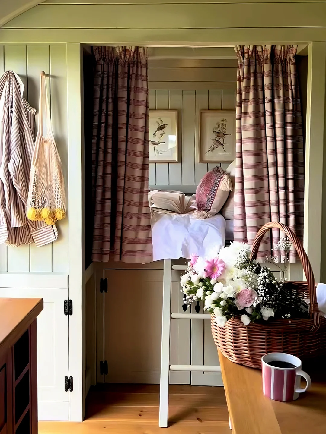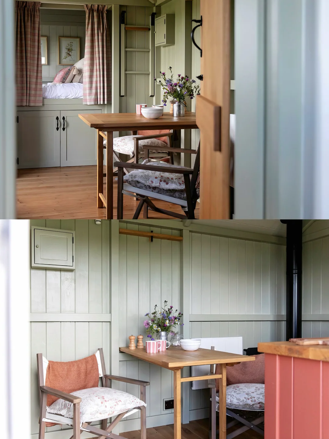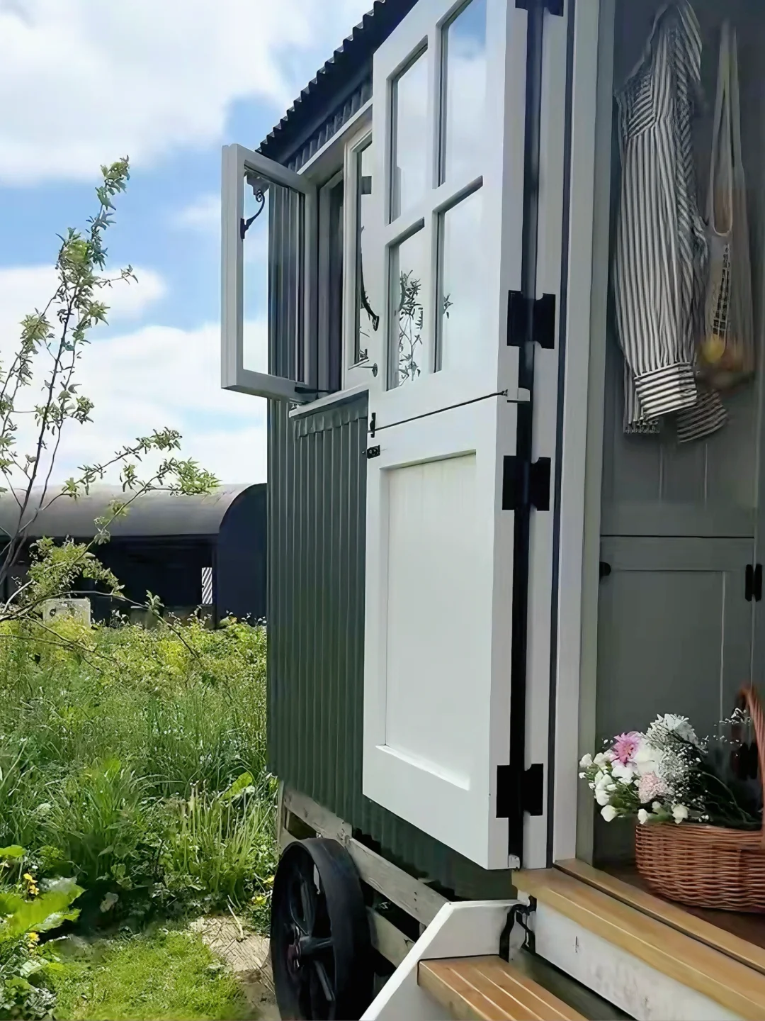 小屋打造的很漂亮,有一张大双人床可以住2人。床周围有遮光百叶窗和窗帘,晚上睡觉也不用担心透光。屋子虽然不算大,但打造的特别好看,从屋子的窗望出去,夕阳西下的时候整个乡村会被蒙上金色的光,巨巨巨浪漫