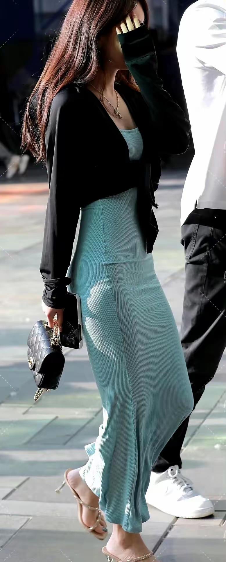 薄荷绿裙装裹着松弛的时髦感,黑开衫一搭就成了街头的冷调氛围,每一步都踩着夏日的慵懒节奏。