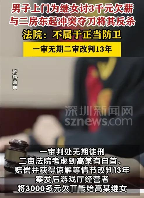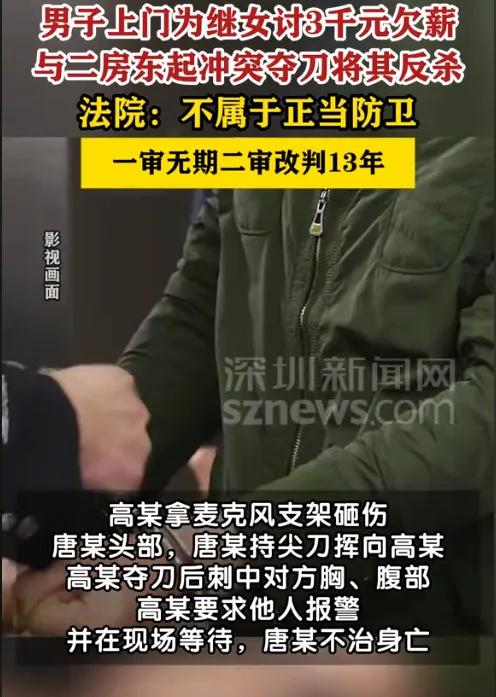 河南鹤壁一起讨薪案让人唏嘘:继父为替继女要回3200元打工工资,和他人发生冲突,最终持刀捅死对方,一审被判无期,二审改判13年。很多网友疑惑“对方先拿刀,为啥不算正当防卫”?本文用大白话还原案件全过程,拆解法律对“正当防卫”的界定,结合网友热议,帮大家搞懂维权和犯罪的边界,普及生活中必备的法律常识。 一、3200元工资没要到,继父讨薪酿成血案 这事儿得从一笔打工工资说起。河南鹤壁的高某,对继女那是真疼,当成亲闺女一样宠。继女假期去当地一家游戏厅打工,辛辛苦苦干了一个多月,3200元工资却被老板拖着不给。 继女委屈巴巴回家哭诉,高某一听就火了——自家孩子的血汗钱也敢欠?安慰好继女后,他气冲冲跑到游戏厅讨说法,结果游戏厅里没人。这时候,一楼开饭店的唐某(游戏厅所在商铺是唐某女儿租的,二层租给游戏厅,一层给唐某开饭店)看到高某在楼上大闹,怕影响自己生意,就上楼阻止。 高某可能误以为唐某是游戏厅老板,两人说着说着就吵了起来,最后直接动手推搡。急眼的高某抄起旁边的麦克风支架,朝着唐某头部就砸了过去。唐某被砸得头破血流,一边捂着头往楼下跑,一边喊“你有种别跑”。 高某不依不饶追了下去,到楼梯间时,唐某看到旁边有把刀,就拿起刀朝高某挥了过去,不过没砍中。紧接着高某冲上去抢过刀,反手就往唐某胸口、腹部捅了好几刀。唐某忍着痛跑到一楼饭店,拿起椅子砸向高某却被挡住,随后直接倒地。 高某见情况不对,让饭店的人打110和120,自己把刀扔到门外,在现场等着民警到来。可唐某送医后,因为肝脏被刺破、体内大面积出血,抢救无效死亡。而另一边,游戏厅老板听说出了人命,赶紧把3000多元工资微信转给了高某的继女,但悲剧已经无法挽回。 二、法律拆解:为啥“对方先拿刀”,却不算正当防卫? 案件一审时,高某一直喊冤,说自己是正当防卫——毕竟是唐某先拿刀挥砍的,自己只是自保。但法院一审认定他构成故意伤害罪,判了无期徒刑。高某不服上诉,二审改判13年,剥夺政治权利5年。 很多网友看不懂:“别人都拿刀砍你了,还手难道不是正当防卫?”这里就得好好说说《刑法》里的“正当防卫”到底是啥意思。 《刑法》第20条明确规定:正当防卫是为了制止“正在进行的不法侵害”,采取的合理手段。重点是两个:一是“侵害正在发生”,二是“手段要合理”,不能超过必要限度。 咱们结合案子一条条看: 1. 首先,冲突的起因是高某先动手。一开始只是口角推搡,是高某先用麦克风支架砸唐某头部,这才把矛盾升级。唐某拿刀挥砍,是被追急了的反击,虽然也属于不法侵害,但根源是高某先发起的攻击。 2. 其次,高某夺刀后已经占据优势,却还继续捅刺。正当防卫的目的是“制止侵害”,不是“报复伤害”。高某抢下刀后,唐某已经没了凶器,赤手空拳,这时候高某完全可以把刀扔掉,或者控制住唐某,而不是朝着胸口、腹部这些致命部位捅刺——这已经超出了“合理防卫”的范围,变成了主动伤害。 3. 最后,唐某已经逃跑,侵害已经停止。唐某被捅后跑到饭店大厅,其实已经放弃了继续攻击,这时候高某还持刀紧追,主观上已经有了伤害对方的故意,不符合正当防卫“制止侵害”的核心目的。 再看量刑:《刑法》第234条规定,故意伤害致人死亡,最高可判死刑。但二审改判13年,是因为考虑到几个从轻情节:一是纠纷因讨薪引发,唐某也有一定过错;二是高某案发后主动报警、在现场等待,属于自首;三是他认罪悔罪,积极赔偿被害人亲属并取得了谅解。这几个因素叠加,才从无期徒刑改判为13年。 三、网友吵翻了!支持与反对的都有道理? 这案子一曝光,网友们直接吵开了,两边观点都很鲜明: 支持改判、觉得高某有点冤的网友: “3200元是血汗钱啊!老板欠薪在先,唐某又先拿刀,高某也是急糊涂了,判无期确实太重,13年还算合理。” 认为高某该担责、防卫过当的网友: “别拿‘讨薪’当借口!夺刀后对方已经没反抗能力了,还往致命部位捅,这就是故意伤人,不是防卫。” 中立吐槽欠薪和冲动的网友: “欠薪的老板才是始作俑者!要是早点发工资,哪会出这事儿?但高某也太冲动了,为了几千块钱毁了家庭!” 不过网友的争论也有道理:你觉得高某的行为算防卫过当,还是单纯的故意伤害?如果是你遇到欠薪,会怎么维权?要是被人拿刀挥砍,夺刀后该怎么做才不算越界?欢迎在评论区分享你的看法,咱们一起聊聊生活里该怎么守住维权底线,又不触碰法律红线!