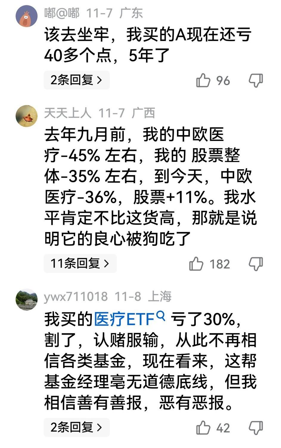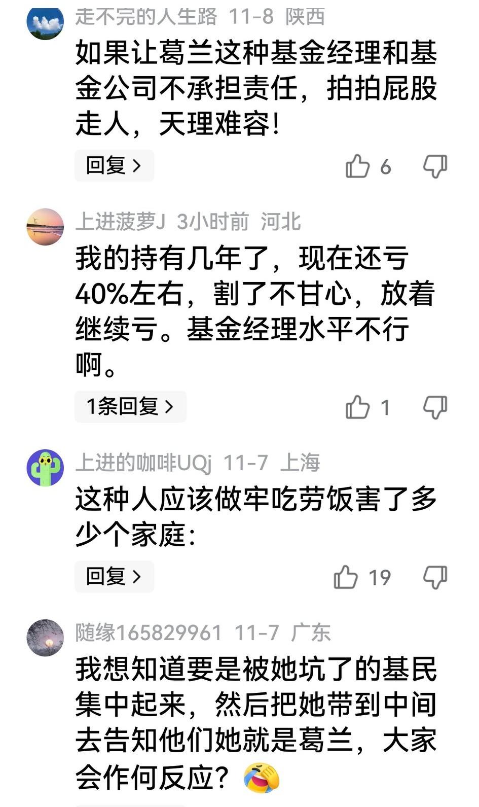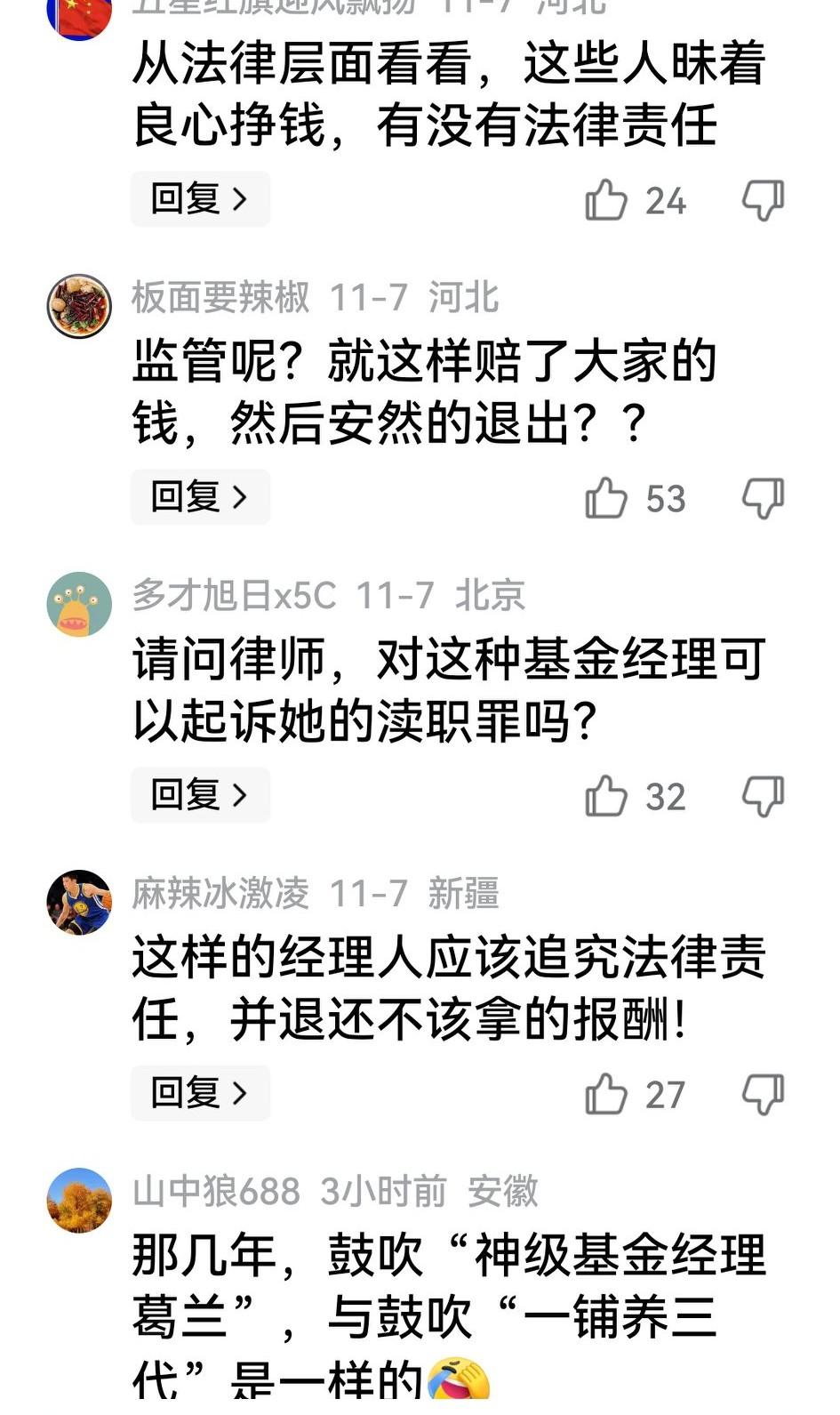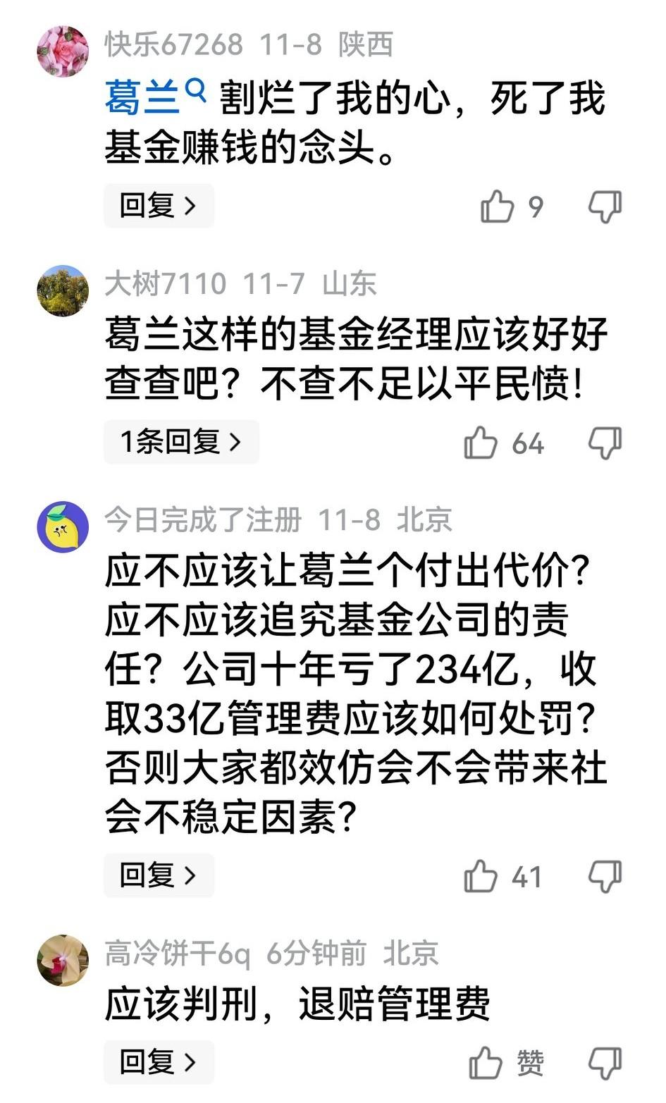 中欧基金经理葛兰呕心沥血,10年为基民亏损234亿元、为公司挣33亿元管理费的消息,引起广大基民群情激奋。 有基民说,去年9月他持有中欧医疗亏45%、自己的股票亏35%,9.24行情以来该基金仍亏36%而他股票已有11%的浮盈。也就是说葛兰不仅跑输大盘,还跑输该散户个人。 评论区普遍不满的是,葛兰既没下课也没承担任何责任,说明她背后有人;还有人要求展开调查,让她入刑。 我要说的是,如果常看机构龙虎榜,就发现游资把股价炒高后,来接盘的机构多得很,这里相当有“学问”。在没有问责机制和赔偿机制条件下,期待公募基金为基民赚钱,概率小得很。