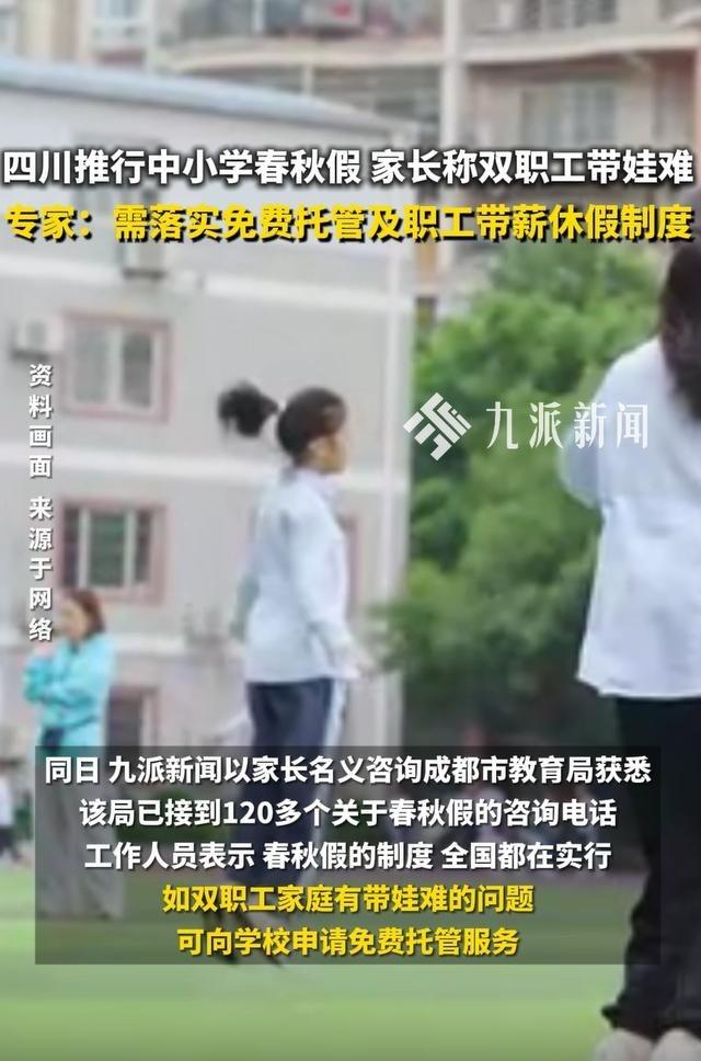 四川在全省实施中小学春秋假制度。这个消息一出,不少家长心里就开始打鼓了。你说现在生活节奏这么快,双职工家庭平时忙得脚不沾地,突然多出两个假期,孩子谁来看管确实是个现实问题。 我正刷着手机看这条新闻,手指冰凉加上肚子咕咕叫,才想起午饭还没顾上吃。有些家长在社交媒体上反映,希望学校能把托管服务安排得更稳妥些。毕竟孩子单独在家,安全问题谁都不放心。 春秋假其实不是什么新鲜事。国内不少地区早就试行过类似安排。这种假期主要是为了让学生们有机会接触大自然,别整天埋在书本里。教育专家提到,这对孩子们的身心发展确实有帮助。 但理想很丰满,现实却有点骨感。很多父母都是上班族,请假并不容易。虽然学校表示可以提供免费托管,但具体怎么操作,各个地方可能不太一样。有的社区或许能组织些活动,但这需要街道、学校多方配合。 我那天看新闻差点忘了回老板消息,赶紧把对话框关了。现在很多单位年假制度执行得参差不齐,要是能落实带薪休假,让家长在春秋假期间灵活安排时间,那情况就会好很多。不过这需要教育部门和劳动部门共同协调,是个系统工程。 从长远看,这种假期模式可能逐渐改变我们的休假习惯。就像黄金周刚出现时大家也不适应,现在不都挺习惯了吗?关键是要把配套措施做好,别让好政策落不了地。 有些家长担心放假太多会影响学习。其实假期安排得当,反而能激发孩子们的学习兴趣。比如学校组织的研学活动,既能开阔眼界,又能学到课堂外的知识。 话说回来,任何新政策刚推出时都会有点不适应。重要的是及时收集家长们的反馈,把托管服务做得更贴心。社区也可以发挥更大作用,组织些志愿者来帮忙照看孩子。 现在生活压力大,养孩子不容易。既要忙工作,又要操心孩子,父母们确实挺辛苦的。如果能趁着春秋假,家长也能休个假陪孩子出去走走,那该多好。 不过这些都还在摸索阶段。各地情况不同,具体实施起来肯定会有差异。相信随着时间推移,这些问题会慢慢找到解决办法。 你说这春秋假最后会变成什么样?会不会像寒暑假那样,成为我们生活的一部分?
