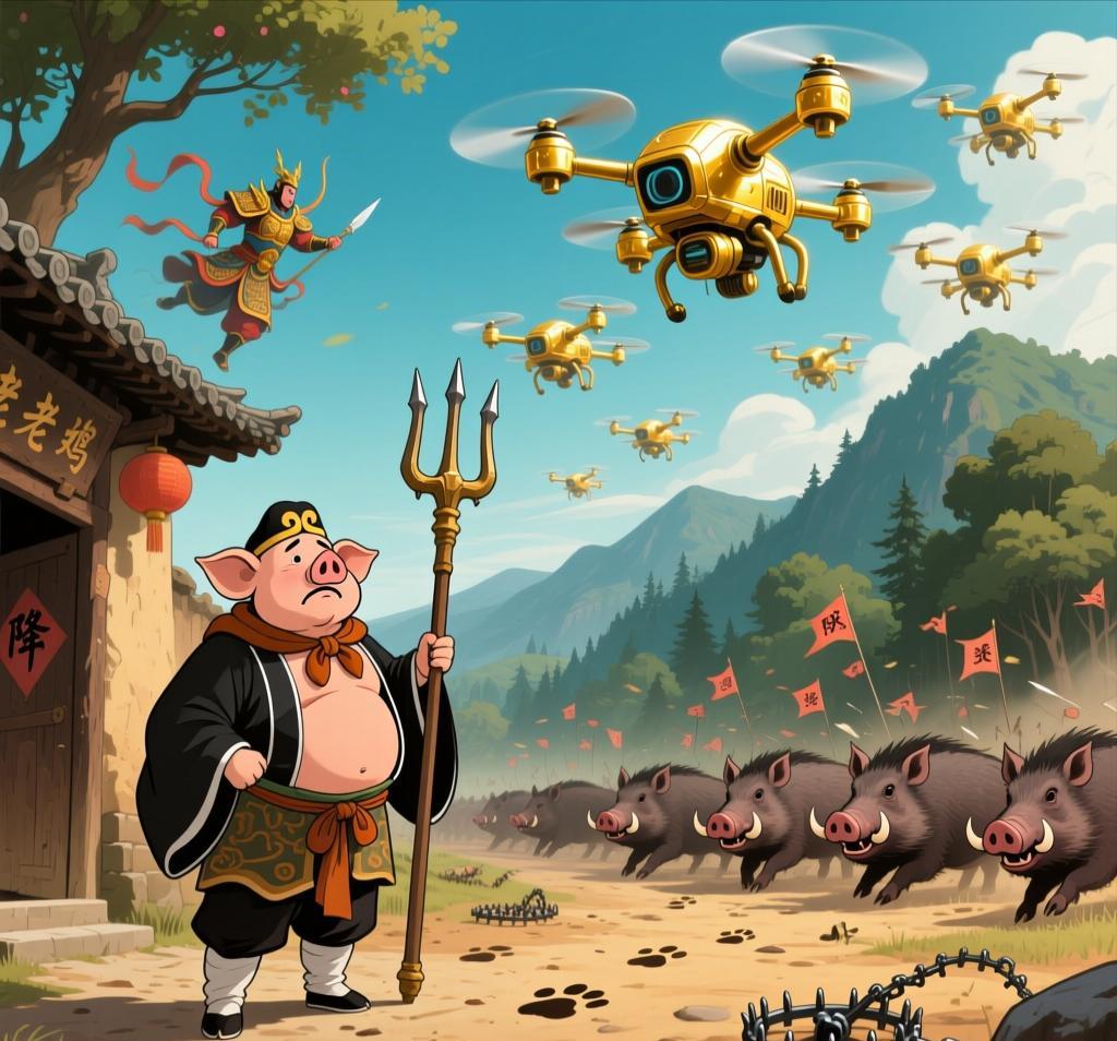 “高老庄”宝鸡分庄闹“猪患”,无人机“天兵天将”下凡降妖! 二师兄的子孙把农田当“自助餐厅”,玉米、红薯炫个光,见到村民拱一大跟头。村民天天提心吊胆,这哪是过日子,简直是“西天取经前传”——天天跟“妖怪”斗智斗勇! 村里试过“土法降妖”: 敲锣打鼓、放鞭炮,结果野猪们淡定如老僧入定——“俺老猪在天庭都见过大场面,这点动静算啥?” 村民没辙,只能求助“天庭总部”:“玉帝啊,快派天兵天将吧!” 这不,“天庭”响应了! 专业团队带着无人机“天兵天将”空降宝鸡——这些“科技天兵”不喝琼浆玉液,专啃“野猪妖”!无人机在空中“巡山”,热成像技术像“千里眼顺风耳”锁定目标;自动发射利箭射杀。打得野猪们措手不及:“这年头,连下凡都内卷,天兵装备都升级了?” 几天下来,猪子猪孙折损二百。 据悉,“天庭”此次派兵花费300万巨款! 村民担心了。 二师兄的繁殖能力,好像分身术。一头母猪,一年两胎,平均一胎7-11个,也就是一年可以生出二十多个小猪。而且最近近年来,它们啸聚山林,几乎没有天敌。山中无老虎,天蓬就是大王。现在它们已经嚣张到不仅称霸山林、上农田吃自助餐,南京分庄的二师兄甚至都敢去高速、居民区、商场逛逛,走到哪里都引起骚乱。 “高老庄”的烦恼还没完: 宝鸡分庄这300万,闹得民议沸腾。 若是天庭有压力,明年不派天兵了,村民日子岂不是又回到从前?二师兄的“分身术”咋破?无人机“天兵”能不能长期“驻守”?其他“分庄”有没有作业可以抄? 评论区聊聊你的妙计,帮村民摆脱“猪患”? (图片AI生成) 野猪中国野猪泛滥成灾,该如何处理?南京南站发生野猪侵线四川广元七旬老人被闯入家中的野猪撕咬受伤