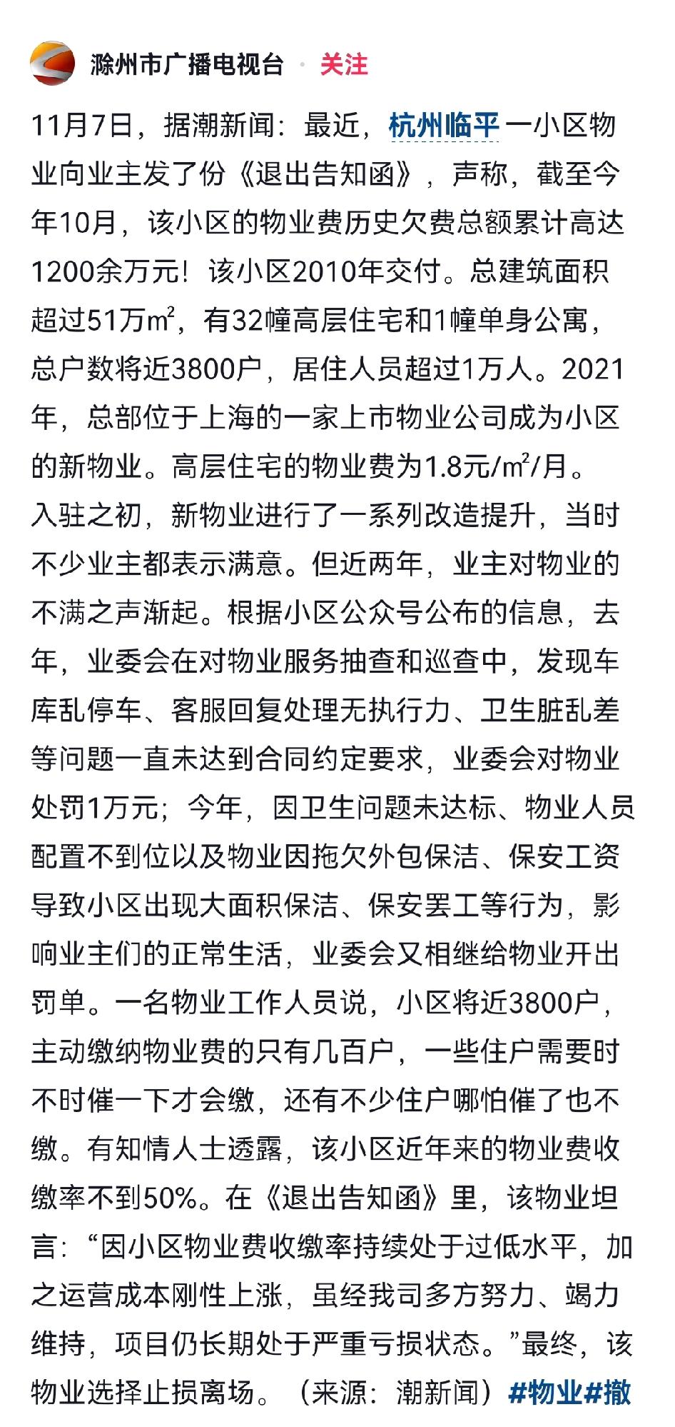 杭州一小区被欠物业费1200万物业退出不干了!很多人对物业的理解就是一个大型的保洁或者保安公司,觉得自己交的物业费太多了,享受到的服务太少。 还有人去对比老旧小区的,一家正规的物业公司要负责公共区域的卫生,绿化的养护,小区的安保,公共设施的维修养护,大部分的物业公司利润真的不高,一般缴费比例在70%以下基本就是亏损的。 我个人理解,物业费不只是服务费,更是小区的生活费。业主不缴费看起来是惩罚物业,实际上是在耗空自己小区的维护能力。 电梯维修、垃圾清运、水电维修这些都是刚性成本,钱不够的话,受损的还是自己的居住环境。 我觉得这种事不是谁对谁错,是小区和物业作为一个共同体,少了一个中间的合作工具。既不能让业主当甩手掌柜,也不能让物业当一言堂,得有个像家庭账本一样的东西,把钱怎么花、服务怎么做,摆在台面上算清楚。 不然换多少个物业,大概率还是会掉进服务差→欠费→服务更差”的死循环里。你怎么看物业费和物业的关系?评论区留言讨论。