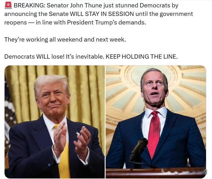 参议员多数党领袖约翰·图恩宣布参议院将持续开会,直到政府重新开放,这与特朗普总统的要求一致。 他们将在整个周末和下周继续工作。