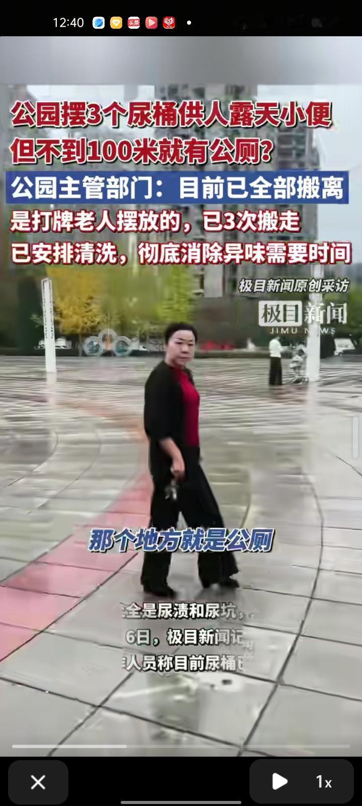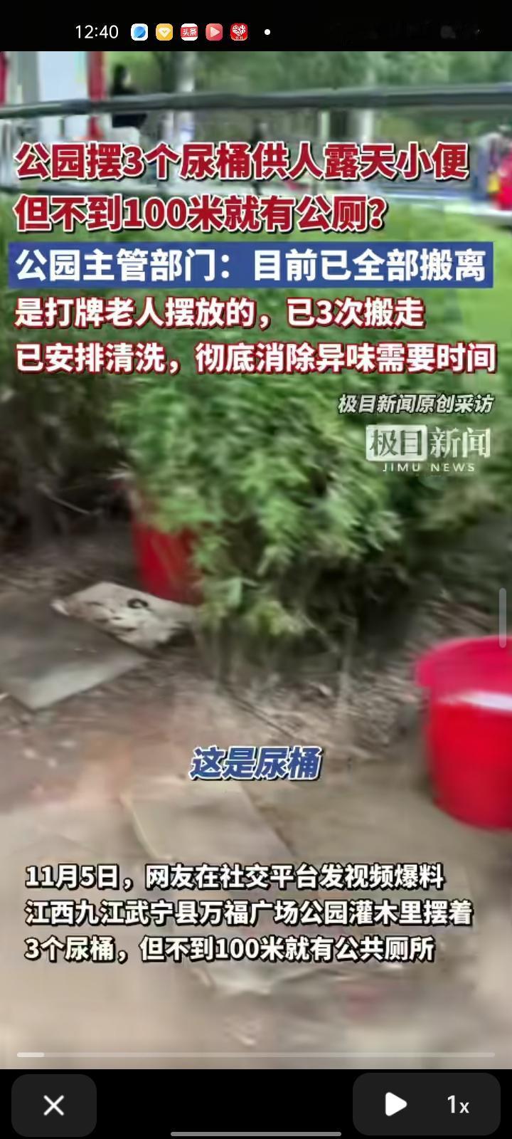 11月5日,江西九江。网友晒视频称,九江市武宁县万福广场公园灌木里摆着三个尿桶,不到100米就有公共厕所,地上全是尿渍和尿坑,空气中弥漫着尿味。 100米是什么概念?也就是花两三分钟就到,非得在灌木丛就地解决,原本空气清新的就这样被尿味污染了,人们来到公园都捂着鼻子走。 公园主管部门回应称,尿桶并非我们摆放,应该是打牌的老人放的,已经三次把尿桶搬走。将安排对该区域进行清洗,但由于尿液渗入土壤,彻底消除异味尚需时日。 公共场所的卫生管理,靠的不只是部门,更要靠我们每个人自觉。公共场所不是自家的后花园,不能为了图方便就把环境给霍霍了。希望下次我们走进公园,迎面而来的不是尿味,而是花香