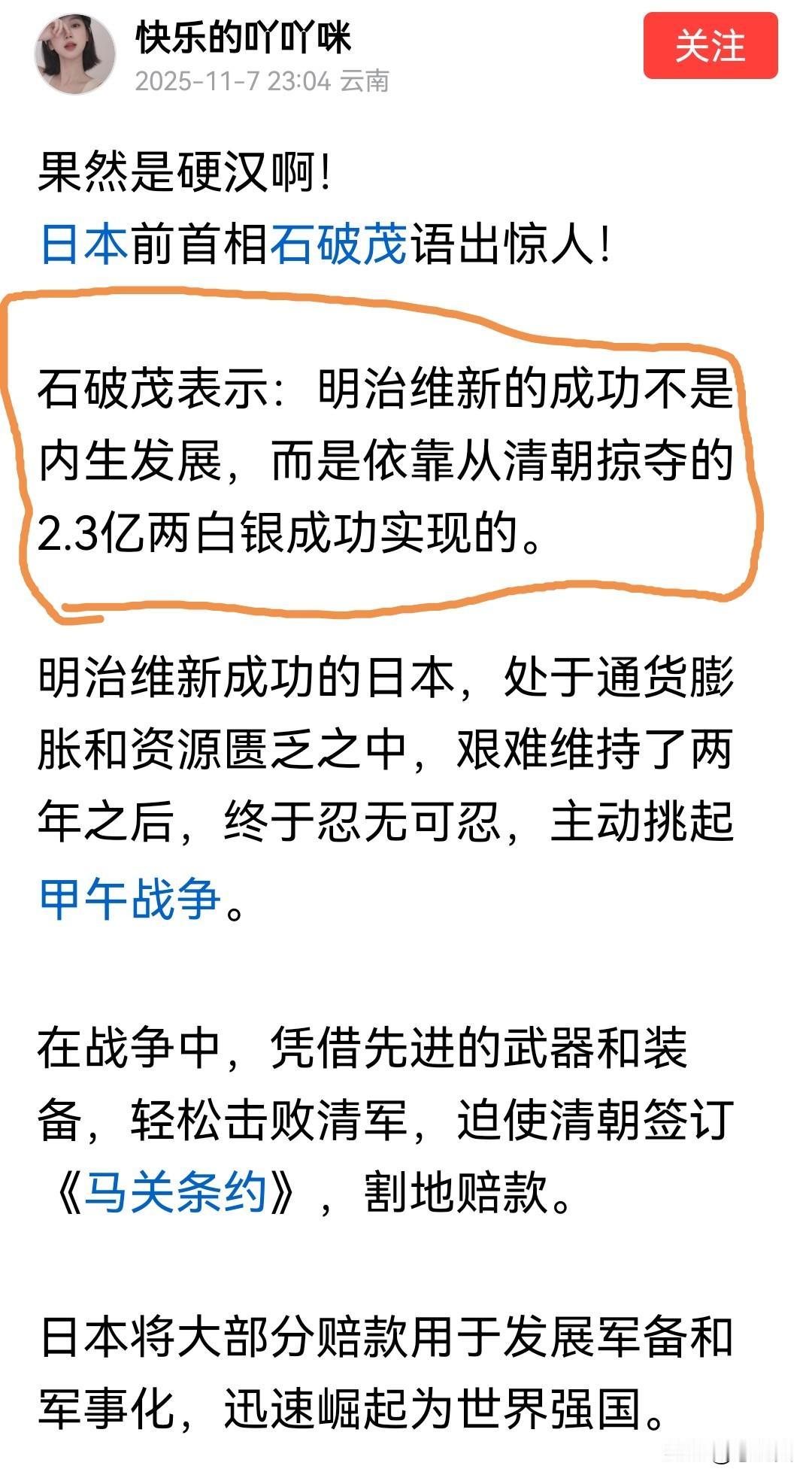 日本前首相石破茂说,日本明治维新的成功是因为战争战胜了中国,获得了2.3亿两白银的赔款。 网友评论说石破茂语出惊人。 其实国内都知道,只是有些人忘却了,日本给中国人民造成的伤害可不仅仅是抗日战争时期。 我们中国人民从来都是以德报怨,要是换个民族的话,以中国现在的实力,不把日本从地球消除是不可能的。 大家说我说的对不?