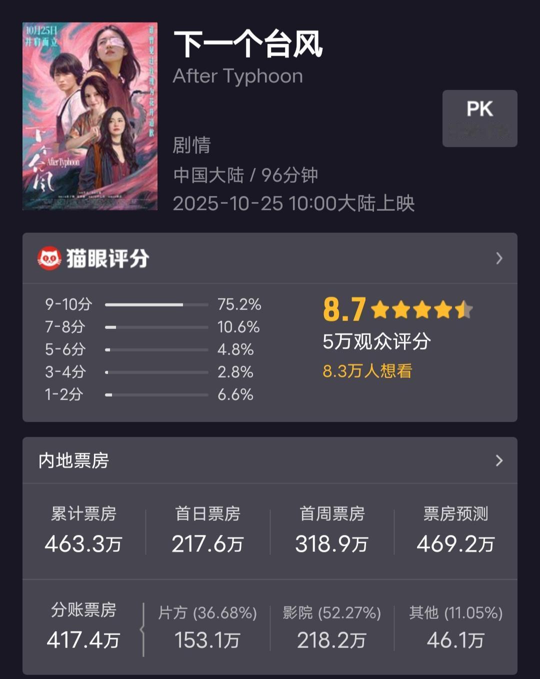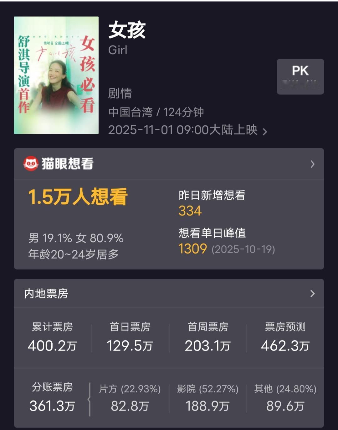 现在电影票房市场真的看不懂,截止到11月9日中午,《日掛中天》上映三天票房1200万,威尼斯影后辛芷蕾也带不动。 刚拿了釜山电影节最佳导演的舒淇,处女作《女孩》上映9天票房400万不到。 影帝黄晓明《阳光俱乐部》上映16天票房600万不到,影后张子枫《下一个台风》上映16天票房460万。 获奖电影几乎都没有好的票房,评委喜欢不代表观众喜欢。花钱去电影院添堵,还不如躺在家里刷短剧更快乐。