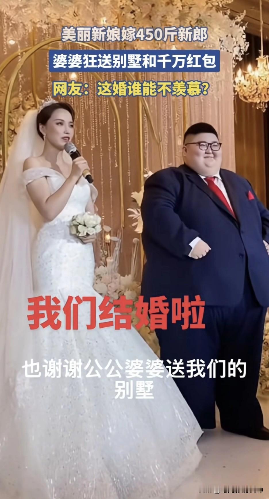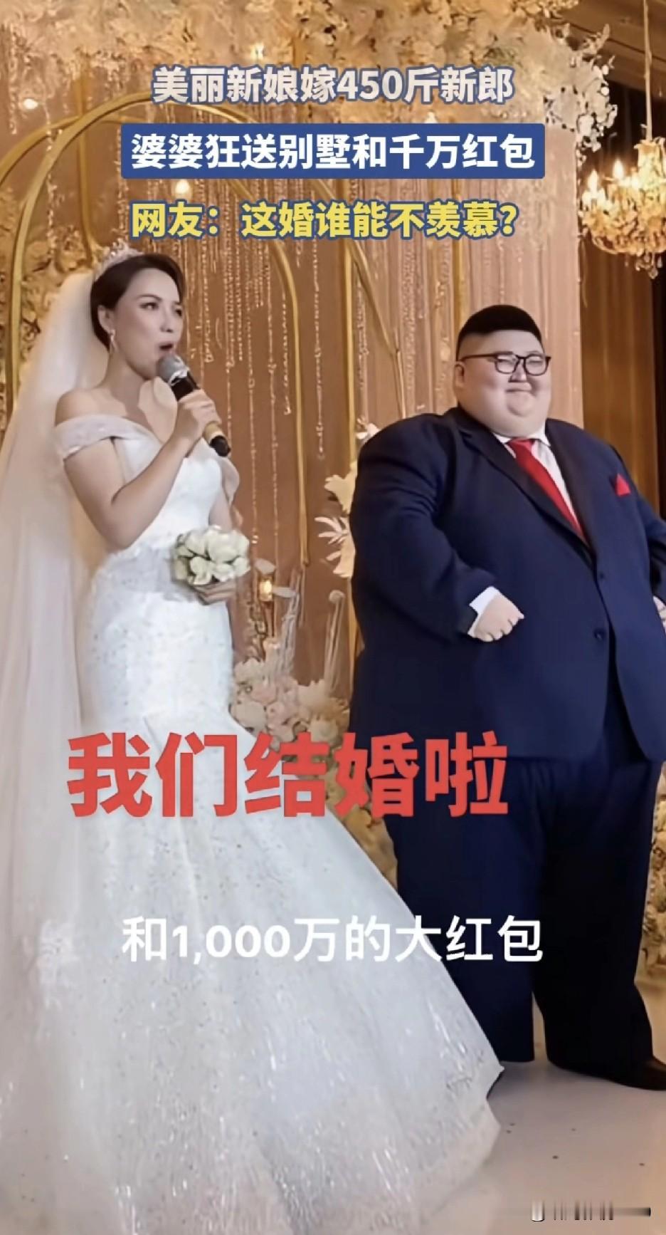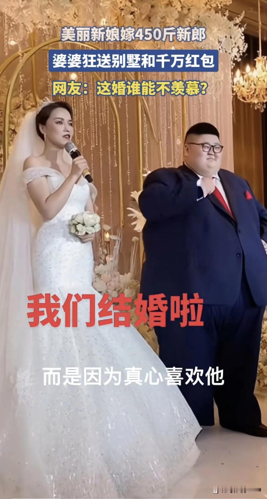 什么?你敢信一位身材高挑的美女竟然嫁给450的胖子!原来真相是… 刚才刷到一条结婚的视频,让我大吃一惊!你肯定会想结婚都不是一个样子吗?但是这对新人结婚真不一样!结婚的男主人公是一位450斤重的身材矮小的大胖子,而女主人公是一位身材高挑长相靓丽的美女。结婚的条件就是:“婆婆送给儿媳妇一套别墅和一千万的红包”。而这位新娘子也没让这位婆婆失望,在婚礼现场用堪称经典的演技对新郎说:“我是爱你这个人,不是爱你的钱”。引起现场宾客交头接耳的一阵唏嘘! 看来在金钱面前,很多人还是经不住诱惑的!尤其这位美女就因为“爱情”弯下了腰。 评论区的网友说:“说到别墅和1000万,我彻底相信了这是真爱。大家就别怀疑了,这才是人世间最真挚的感情”。确实我也觉得这对新人是因为“沉甸甸的爱情”才走到一起的! 不过话说回来,我们也不要觉得女孩物质,在现实面前又有几个人能经得住这样的诱惑,你觉得呢?