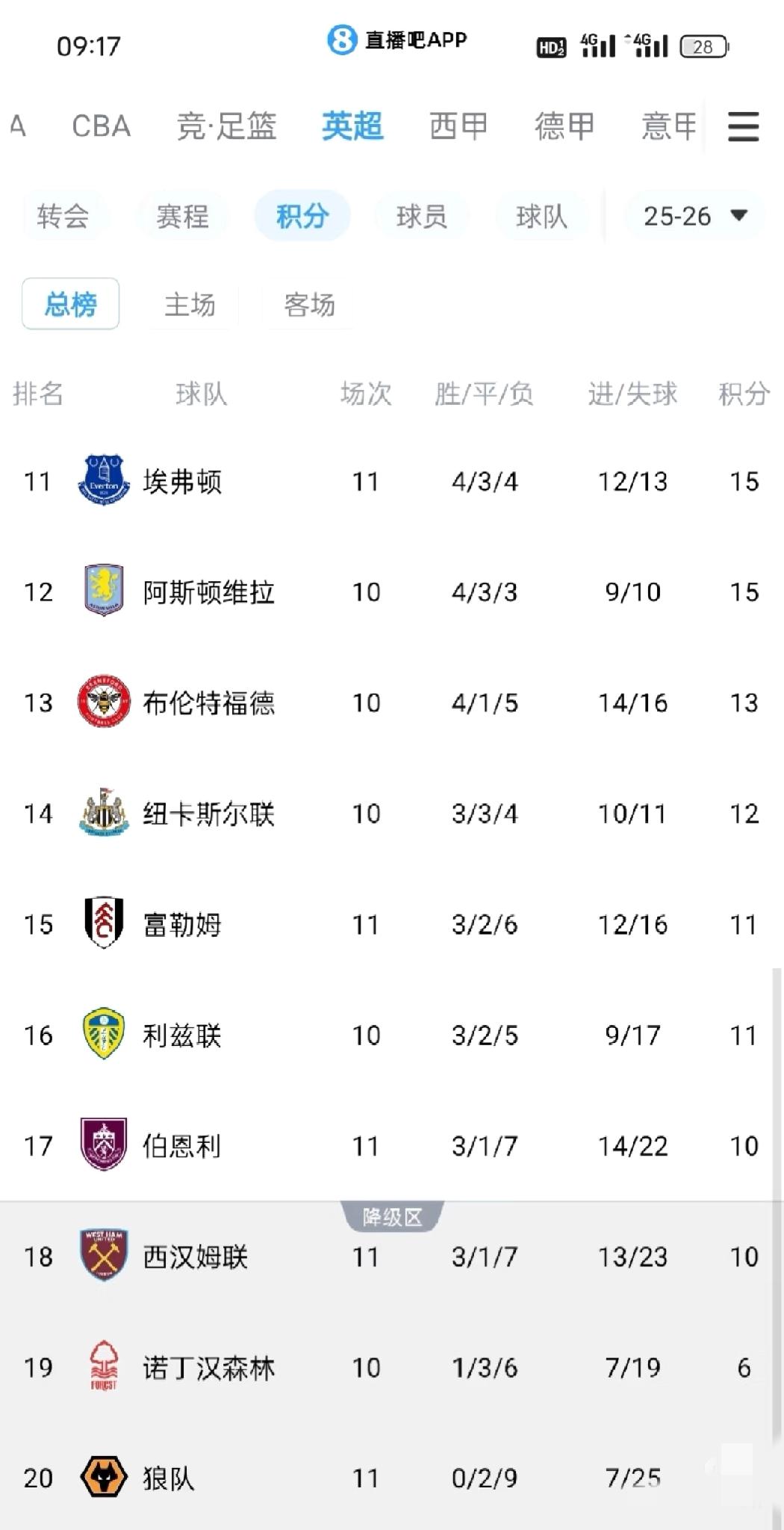 英超是越来越乱了。 我去,这四场输球太逆天了,整个上半区都看不到有输四场的球队,但凡少输一场,都不至于参与中游球队排名天天变的乱局。