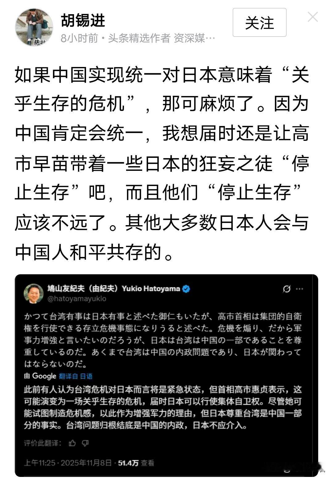 比起以前的和稀泥,老胡的观点和思路越来越清晰越来越分明了,对高市早苗们的狂言乱语,老胡直言它们应该“停止生存”! 需要注意的是高市早苗的支持率是很高的,说明是得到日本民众认同的,像鸠山由纪夫这样清醒明白的日本人反而是少数派。 对于高市早苗大多数日本人并不担心,只要她能履行诺言,我们更没有理由担心了……