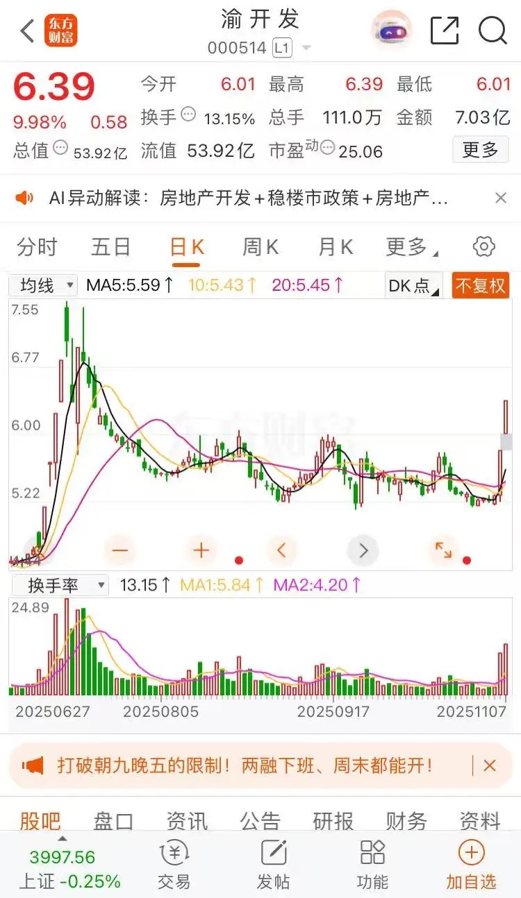 渝开发涨停板收盘报收6.39元每股,成交金额7.03亿元,周一涨停板刚好是成交金额7.03元每股。