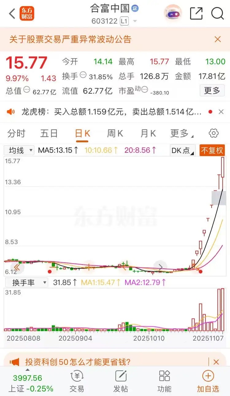 合富中国涨停板收盘报收15.77元每股,成交金额17.81亿元,9连板,不会成为跨年妖股吧!尾盘涨停非奸即盗,注意风险