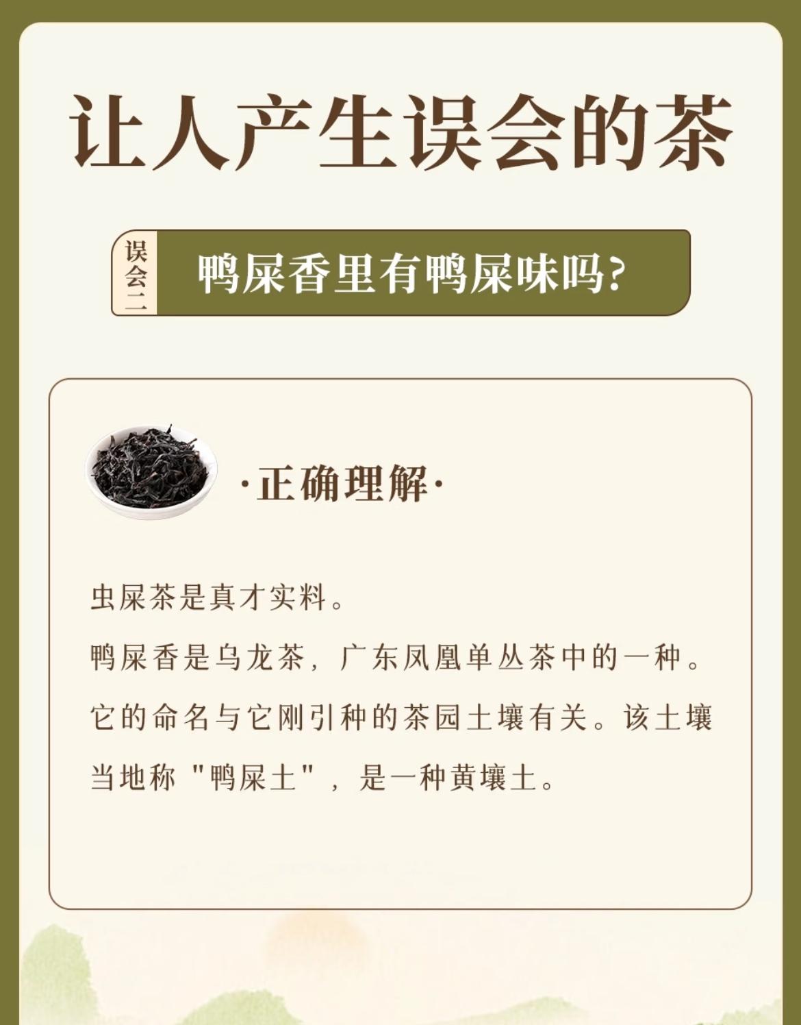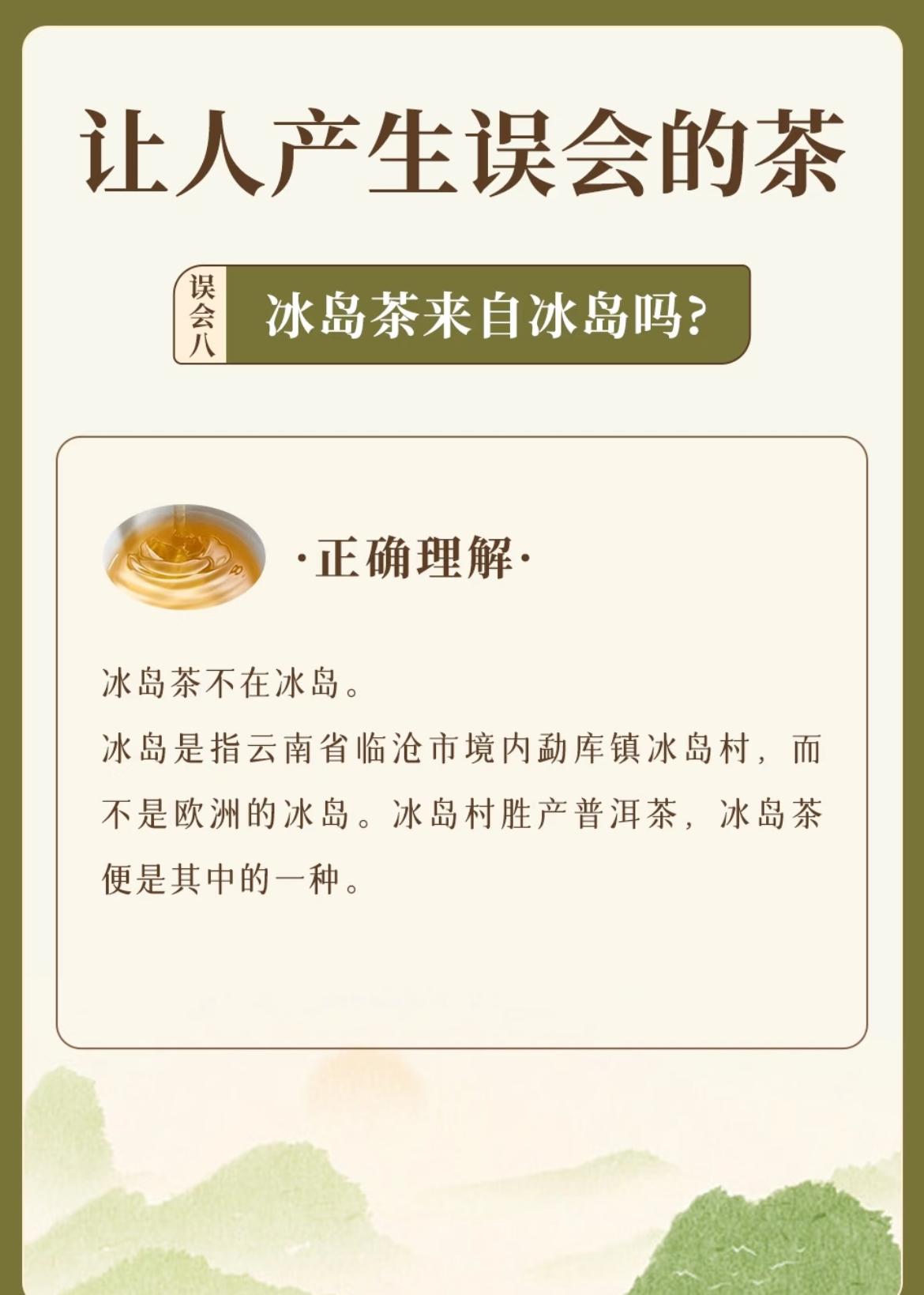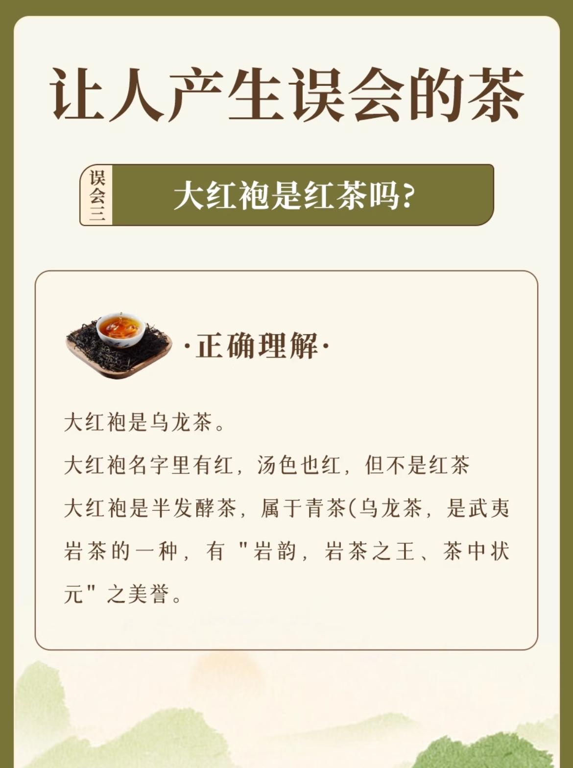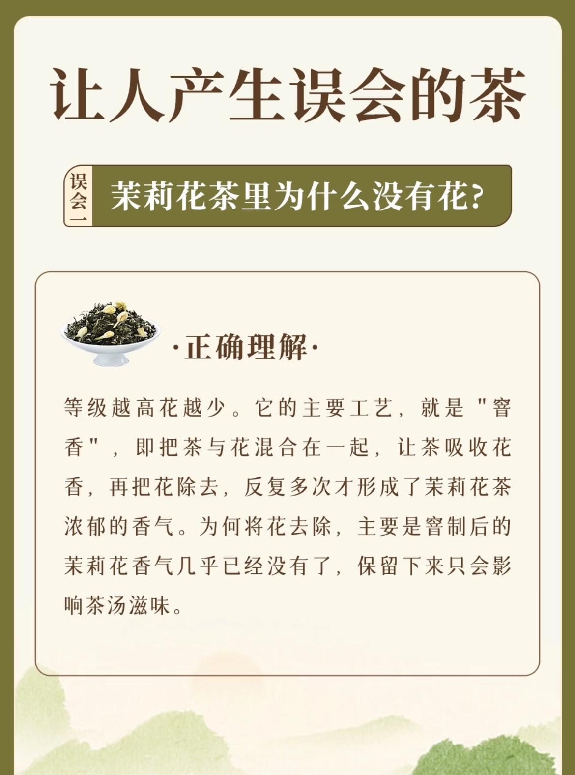 最让人产生误会的八款茶,你都知道吗? ⭕误会1:茉莉花茶里没有花是真的 是窨花工艺 ⭕误会2:鸭屎香和鸭屎没关系 是凤凰单丛茶 ⭕误会3:大红袍不是红茶 是乌龙茶 ⭕误会4:安吉白茶不是白茶 其实是绿茶 ⭕误会5:洞庭碧螺春不来洞庭湖 来自洞庭山 ⭕误会6:抹茶源自中国 ⭕误会7:铁观音不是绿茶 是乌龙茶 ⭕误会8:冰岛茶产自云南省临沧市境内勐库镇冰岛村