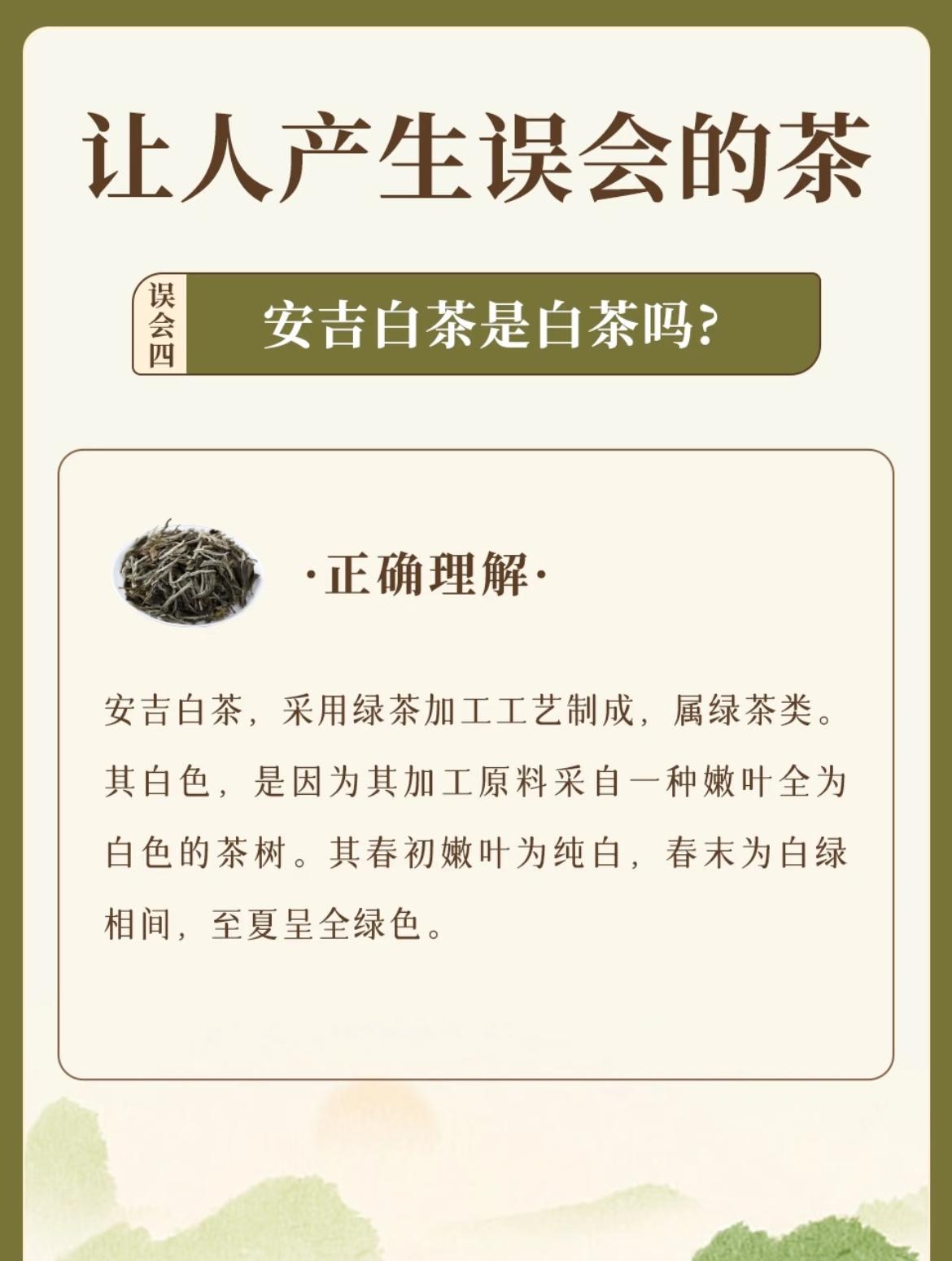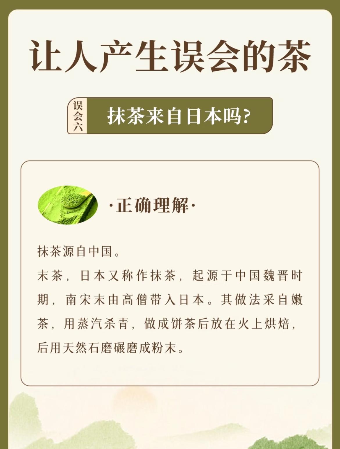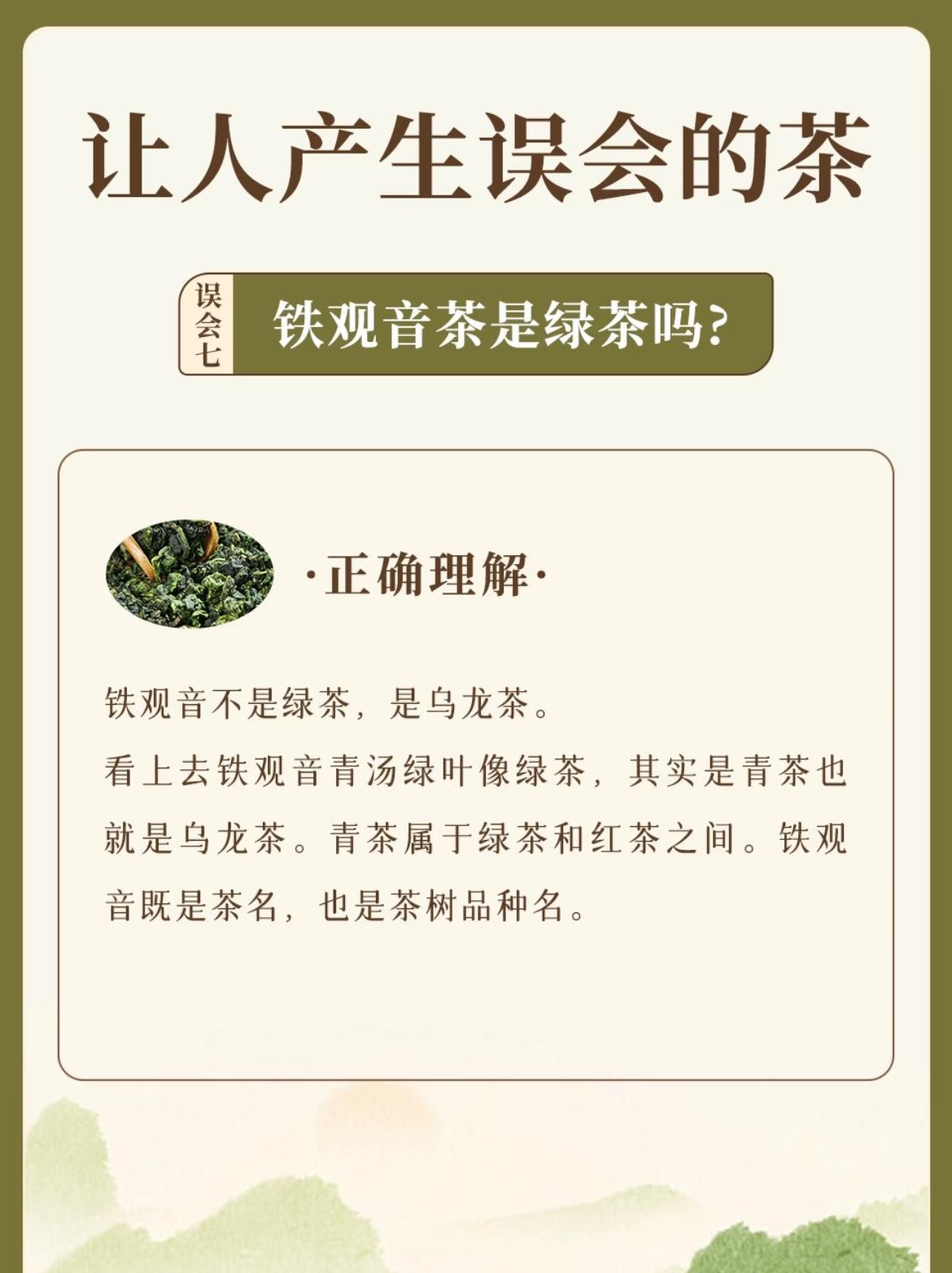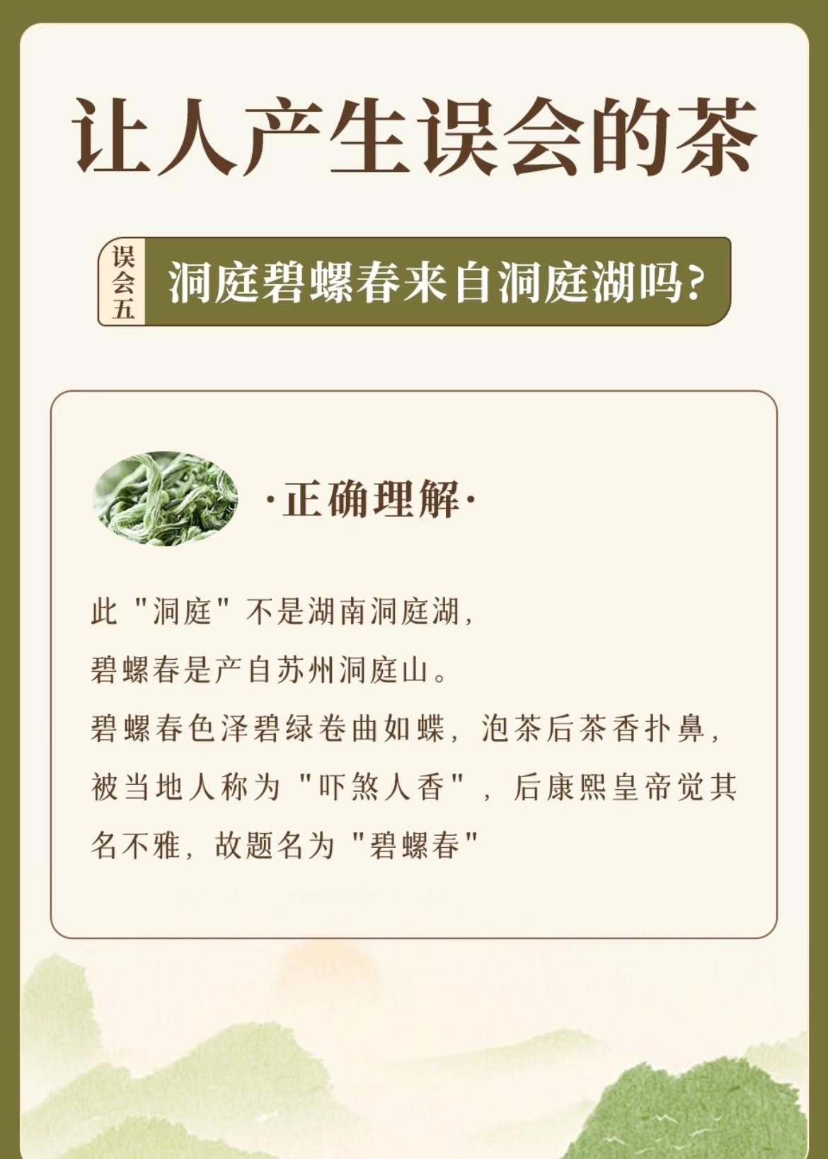 最让人产生误会的八款茶,你都知道吗? ⭕误会1:茉莉花茶里没有花是真的 是窨花工艺 ⭕误会2:鸭屎香和鸭屎没关系 是凤凰单丛茶 ⭕误会3:大红袍不是红茶 是乌龙茶 ⭕误会4:安吉白茶不是白茶 其实是绿茶 ⭕误会5:洞庭碧螺春不来洞庭湖 来自洞庭山 ⭕误会6:抹茶源自中国 ⭕误会7:铁观音不是绿茶 是乌龙茶 ⭕误会8:冰岛茶产自云南省临沧市境内勐库镇冰岛村