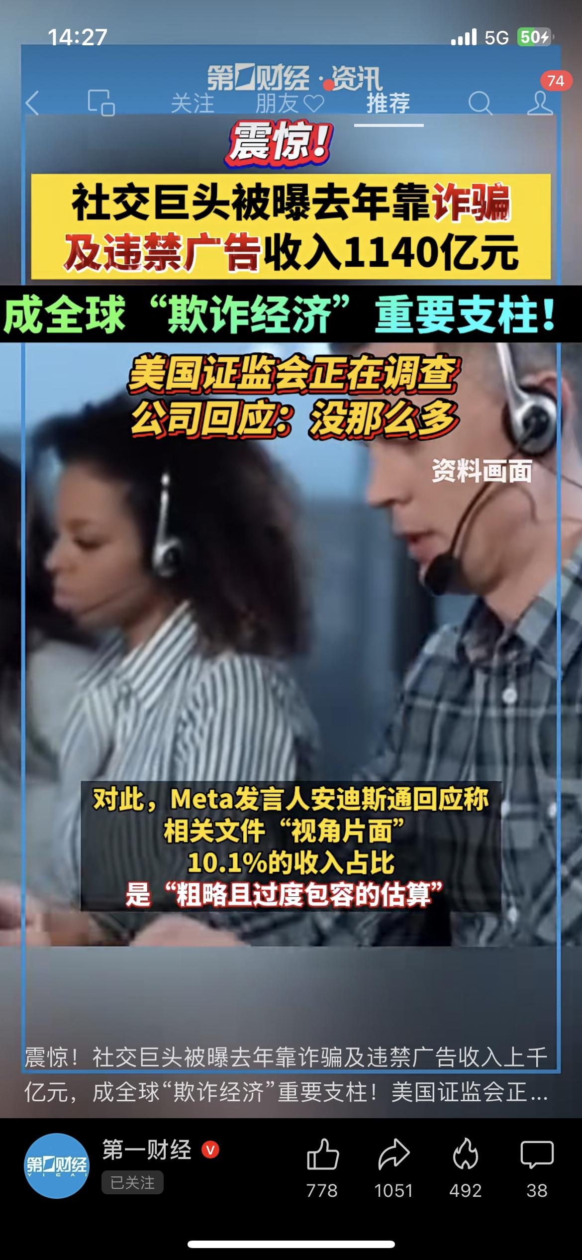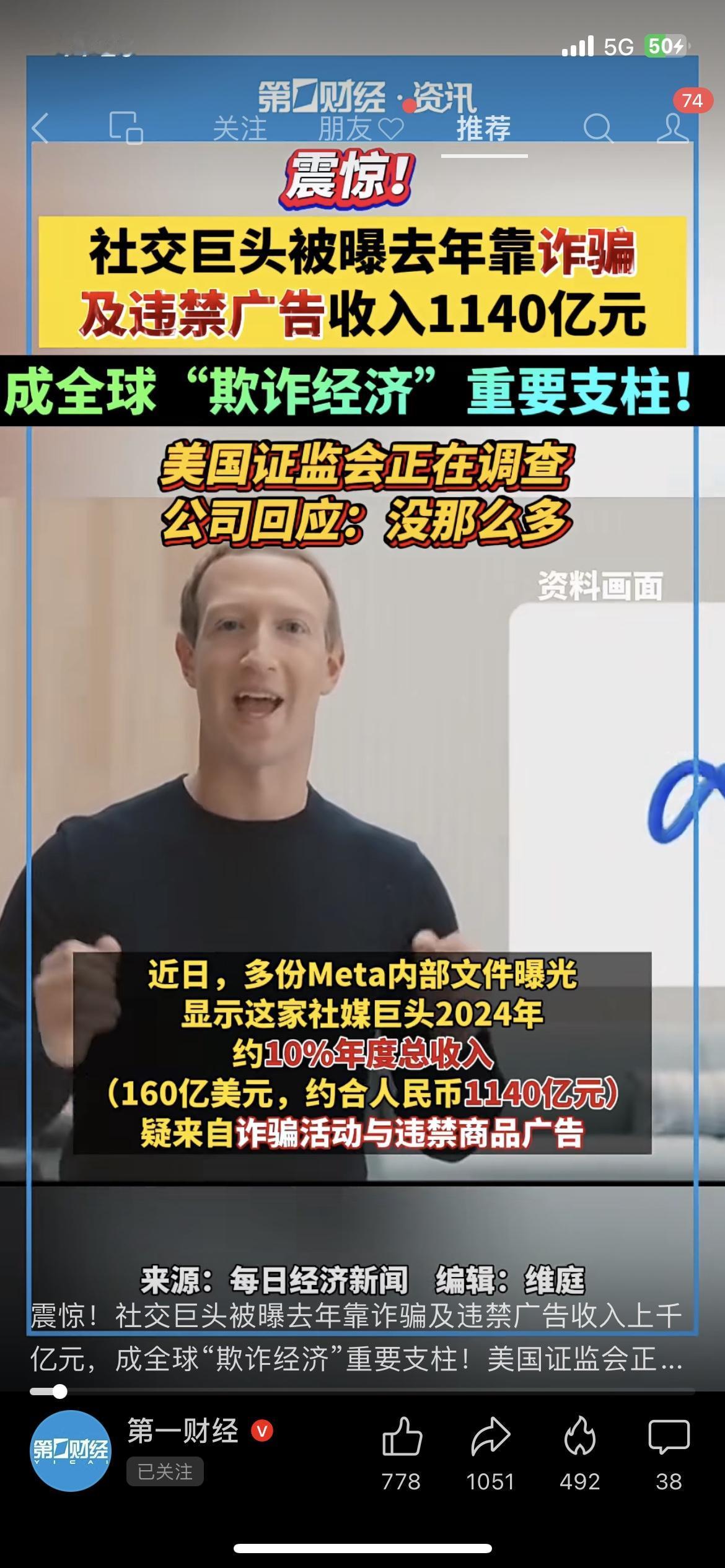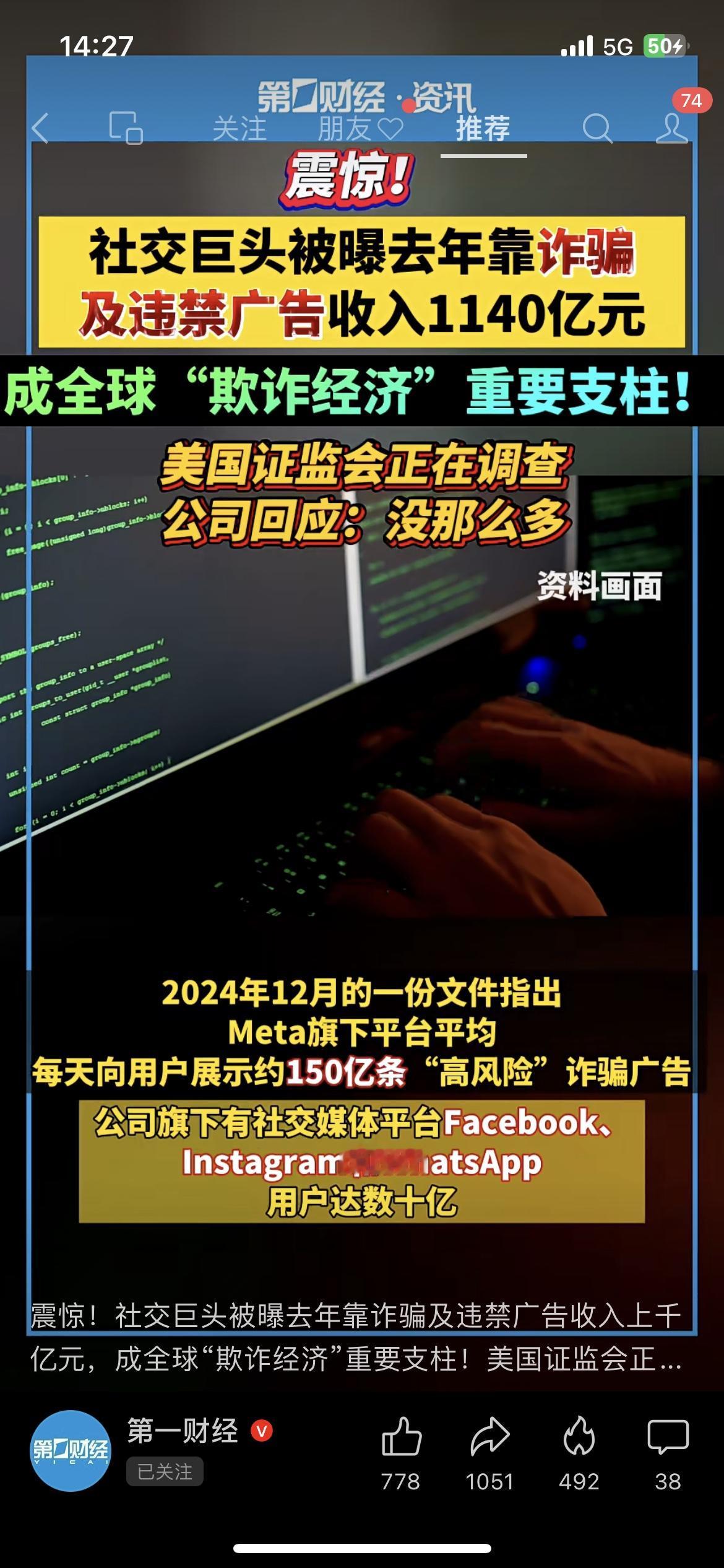 社交巨头Meta一天推150亿条诈骗广告?去年靠这赚了1140亿,美国证监会都查了! 刚刷到个离谱的瓜:全球几十亿人用的Meta(就是Facebook、Instagram的母公司),去年居然靠诈骗、违禁广告赚了1140亿人民币? 内部文件说,他们每天给用户推150亿条“高风险”诈骗广告——这相当于每个用户每天被塞几十条坑人信息啊!现在美国证监会都在调查这事儿了,结果Meta回应说“数据片面”“估算太夸张”… 咱就是说,几十亿用户信任的平台,靠骗普通人赚钱?这钱拿在手里真的不烫吗?以后刷社交平台,看见陌生广告可得多留个心眼!
