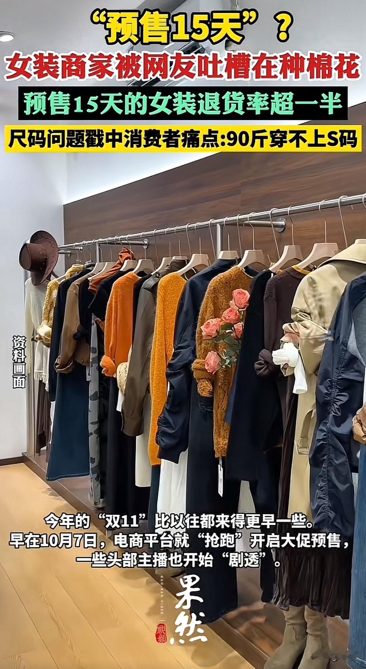 双11期间,女装“预售15天甚至45天”的情况又被网友吐槽“店家是在种棉花吗”。