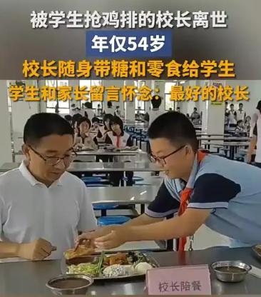 泪目!被学生抢鸡排的可爱校长,永远离开我们了![流泪]我还清晰记得,当时看到这个视频,心里好暖。校长食堂陪餐,一个小男孩端着餐盘走过来问,“校长,鸡排你吃吗?”校长以为小男孩要把鸡排给他吃,就笑着摆手:“不吃”。谁知小男孩马上将筷子伸到校长餐盘里,把鸡腿夹进了自己的餐盘!校长终于搞明白了孩子的套路,于是主动发问:“粽子你吃吗?”学生立马回答:“吃!”然后又伸到校长餐盘里,夹走了校长的粽子! 当时就想,这校长真好。 小男孩顽皮,但是敢“套路”校长,打心眼里是得多亲近、多喜欢这个校长!我们读书时,见到校长,都和老鼠见了猫一样,躲得远远的,哪里还敢“虎口夺食”。 再后来刷到的确是坏消息。 这么快,这个校长上个月因病离我们去了,才54岁。 出殡仪式,上千人出席。 “抢鸡排”的男生留言:这次,我要把鸡排留给他。“但苗校长吃不到了。 苗校长是怎样的人? 苗本臣校长,就职于济南历城区仁里学校,据说平时就非常爱孩子,每天都会在校门口迎接孩子们,无论风雨,坚持多年。课间他会陪孩子们跑操。平时兜里会揣着点糖果或者零食,见到孩子们会给,特别平易近人,没有架子。所以孩子们都很喜欢他。 可惜这么好的校长,工作太劳累,却忽略了身体健康。 校门口坚守的身影,兜里分不完的甜,爽朗的笑声,会永远留在孩子们心里。当千名师生在寒风中送别校长,校长却早把春天的种子,种进了每个孩子心里......