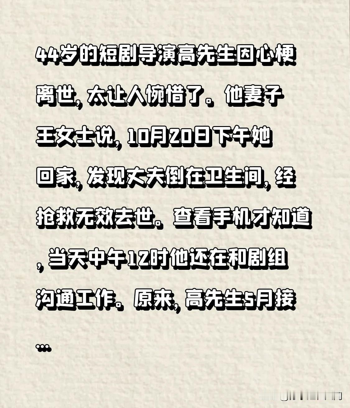 44岁的短剧导演高先生因心梗离世,太让人惋惜了。他妻子王女士说,10月20日下午她回家,发现丈夫倒在卫生间,经抢救无效去世。查看手机才知道,当天中午12时他还在和剧组沟通工作。 原来,高先生5月接触短剧行业,9月底筹备拍摄,担任副导演。拍摄时每天一两点收工,早上七点又开工,几乎没休息。10月14 - 17日拍完,18日回家说累,19日还忙到很晚。谁能想到,20日就阴阳两隔。丈夫因工作逝世 高坠身亡 心梗索赔 演员轻生 高闻去世 高绪仁去世