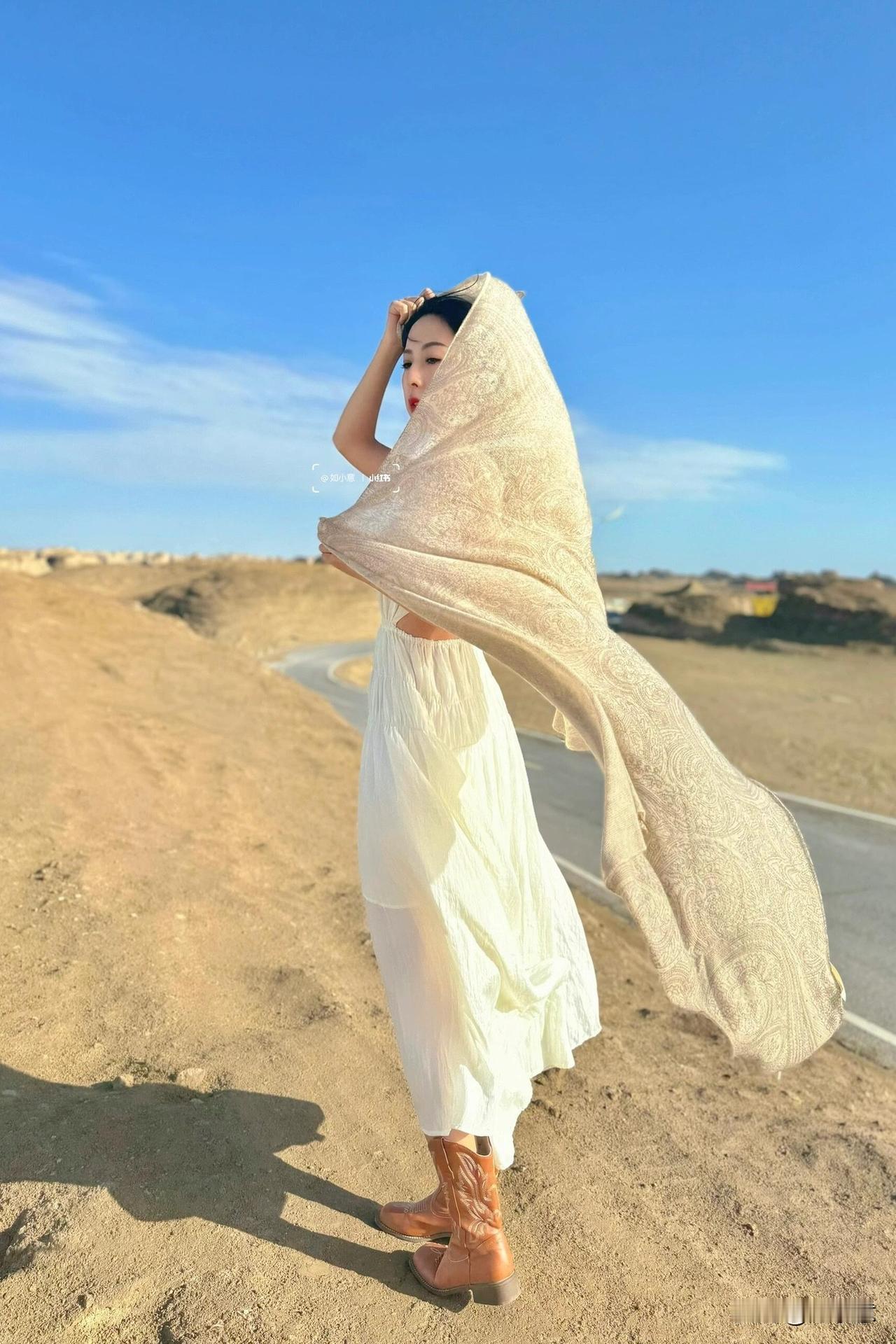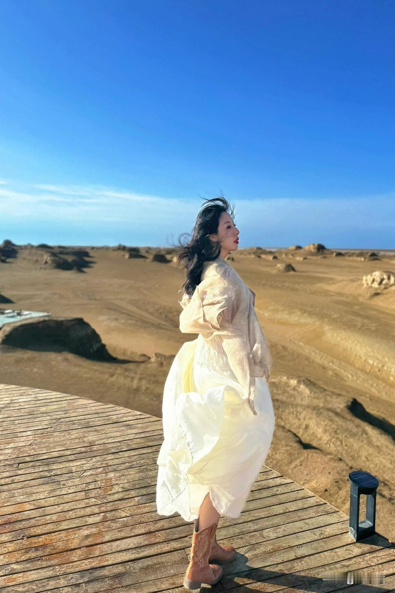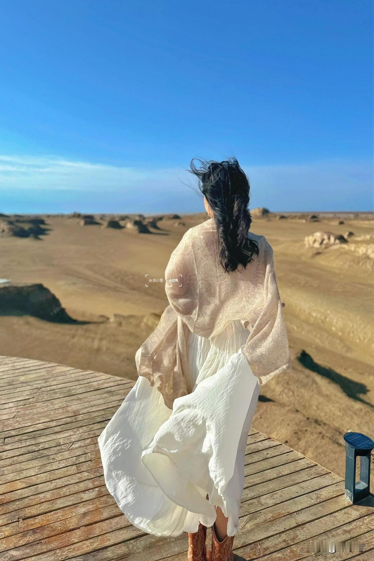 在戈壁🏜️与雅丹来一场邂逅 今年一直在旅行,把自己放在世界里 心自然宽广辽阔~🏜️ 穿上白色🤍长裙,披上围巾 融入在雅丹戈壁的广袤风景里 迎风而往,无畏天寒 每一张都是大片~ 人生海海,山山而川 心之所见,远胜于目