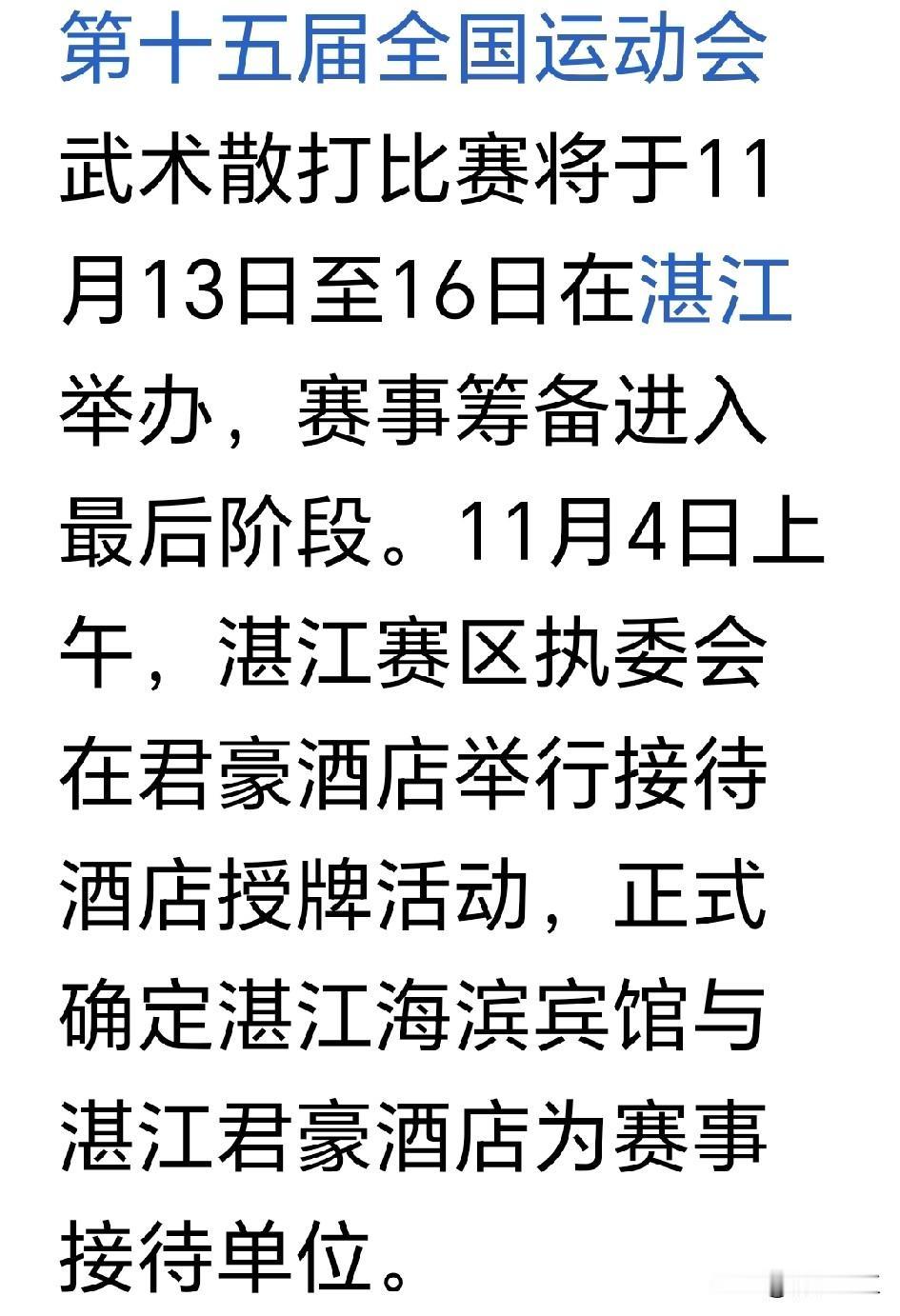 第十五届全国运动会开幕式于11月9日晚在广州的广东奥林匹克中心运动场开启,中国正式已经进入全运会时间。虽然这届由广东、香港、澳门联合主办的全运会也叫大湾区全运会,但是咱们湛江市也有安排全运会比赛项目,其中武术散打比赛在11月13日至16日在湛江奥体中心举行,大家记得到湛江奥体中心观看比赛。