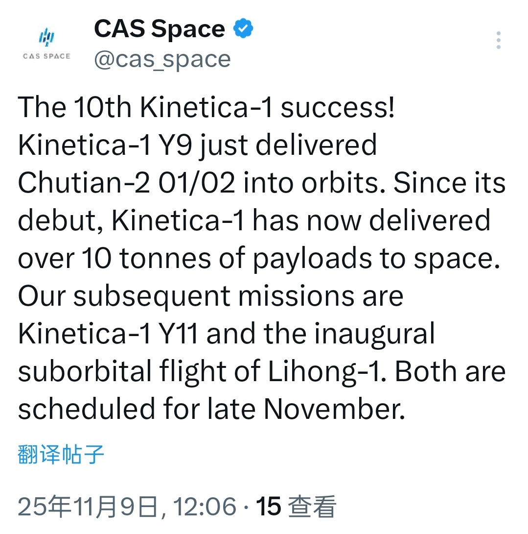 中科宇航海外社交平台透露,"力箭一号"遥11火箭和”力鸿"亚轨道旅游可重复使用飞行器将在11月下旬发射。