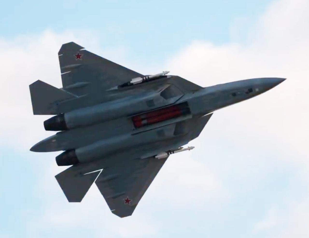 Su-57弹舱开舱图和视频 茧包弹仓和机腹弹舱都开了舱门。多少年了,终于肯曝光了 格斗弹仓能塞进两枚R73,两个机腹主弹舱能塞进四枚KH58,载弹量很不错。 图源网络 烽火问鼎计划