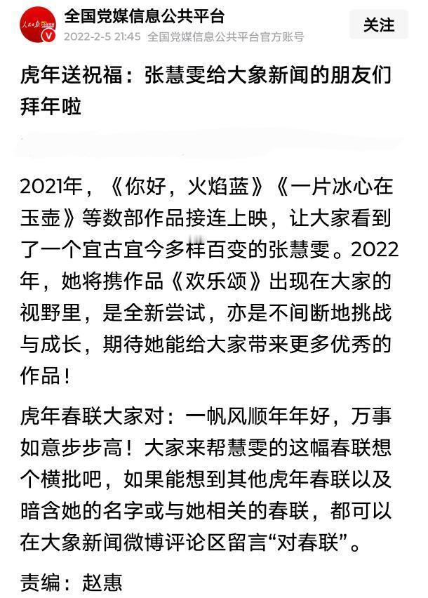 张慧雯作品不多不滥市,每一个角色都不雷同,但你仔细去看,她的作品上卫视和央视的比例之高。而且,她只要有好角色,采访报道她和她作品的媒体,都是一些拍一堆平台剧,号称一堆粉丝的明星从没机会上过的媒体。 而且,张慧雯能得到联合国和平使者,著名自然科学家珍古道尔邀请参加全是专家与学者参加的小型慈善沙龙,这在90后明星中少见吧? 写张慧雯,据实对她做正面的报道;和她合作的明星的粉丝不夸她,也别胡说她,争取合作双方都涨粉涨人气,就不会有错,一定会双赢!