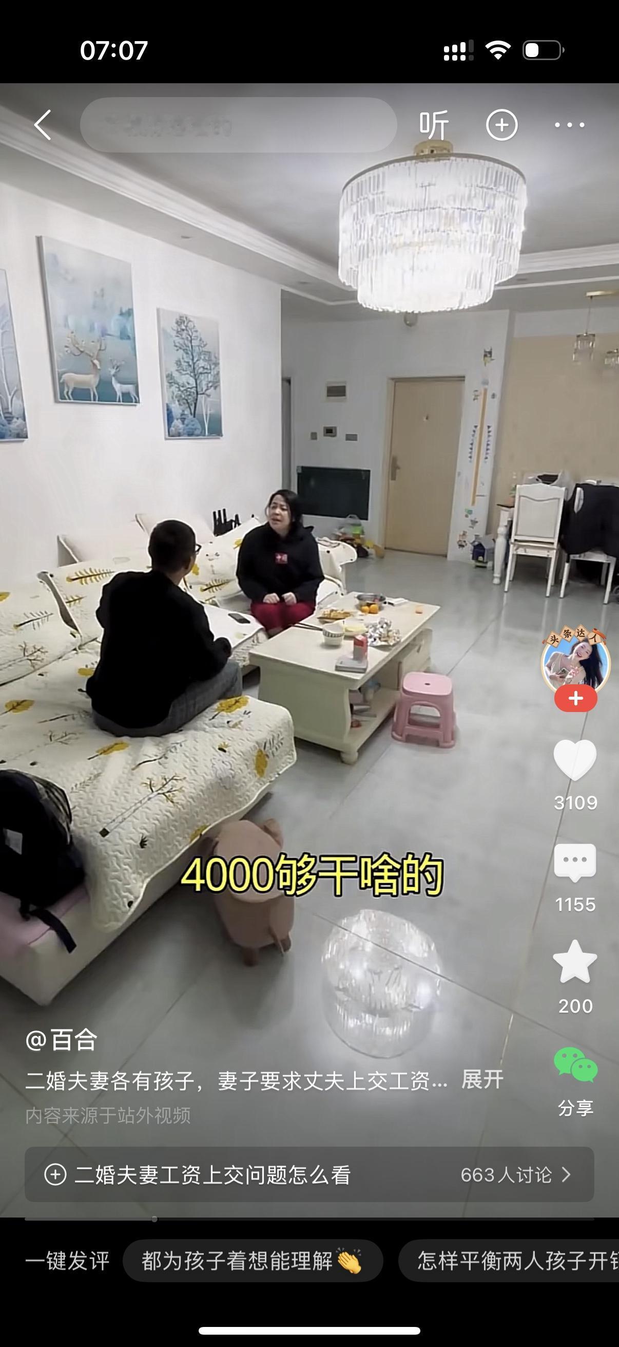 男人和女人二婚组建的家庭。女人抱怨男人每个月给自己4000太少了,还不够买豆芽菜的。要男人把全部工资上缴。男人却说,我一个月挣12000,你一个月赚4000,能一样吗?我能把钱全给你?女子说,我和你结婚,你总是怕我骗你吗?男人说,人心隔肚皮。你有个儿子。我把钱全部给你,到时你都给了你儿子。我女儿咋办?女人知道说什么都没用了,提出要离婚。男人欣然答应了。这二婚组合难弄。