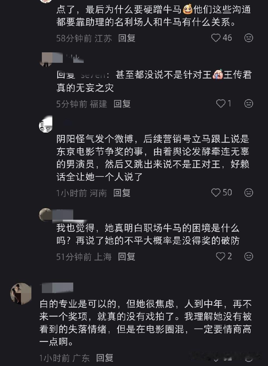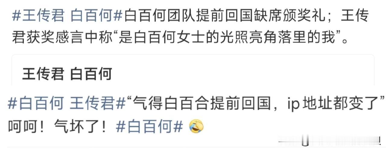 我觉得白百合破防的原因有两个。 一是辛芷蕾刚拿了柏林影后,白百合觉得自己比她成名早,也早该拿了。 二是电影拍摄时,导演和同事们估计都夸她演得好。正常的客套话,白姐却当真了。 于是带了获奖时礼服,带着俩儿子高调去了东京。 本来想让儿子们一起见证她的荣耀时刻的,结果她却没得奖。而且导演和男主都拿了,就她没拿。 于是她就撒泼开始带节奏,先是暗指王传君抢了她的影后名额,后又骂导演忘恩负义。 眼见舆论控不住了,又说一句「体面为好」 咱就是说,从头到尾不体面,都只有白百合一人吧[捂脸][捂脸]