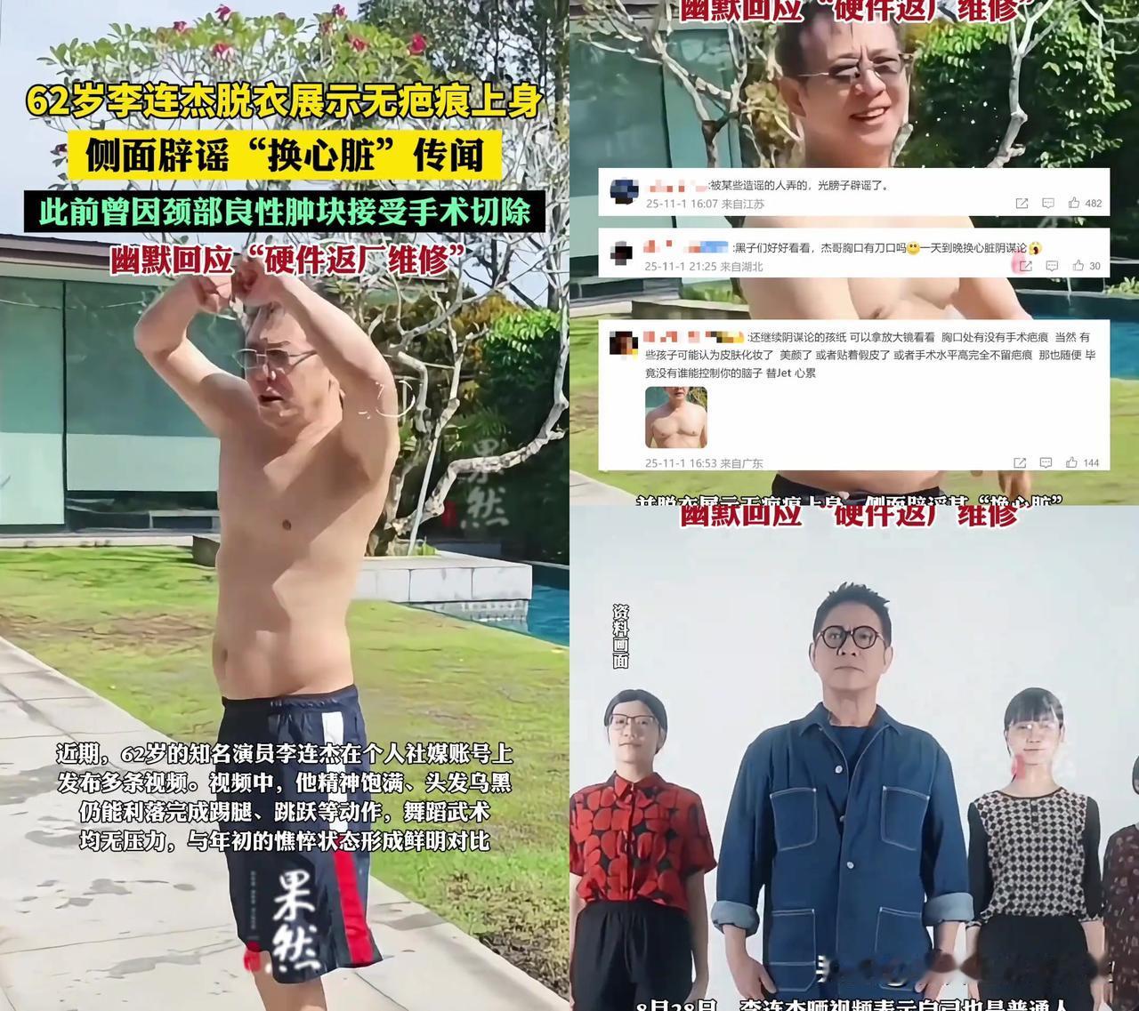 杰哥最近脱上衣,被造谣“换心脏”逼急了,并非为了秀身材! 62岁的他发vlog晒游泳,直接露胸口说“拿放大镜找刀口”,之前全网传他“活不长”“心脏有疤”,连粉丝都半夜查他病历。 之前还幽默回应“硬件返厂维修”,现在能跳能打,和年初憔悴得不成样的样子,反差太大了。 有人心疼:“60多被追着骂‘假皮’‘美颜遮疤’,太委屈”;也有人杠:“越澄清越有问题”“肌肉外衣”“雕虫小技”。 换我早急得骂街,他倒笑着说“不OK也OK”,打了一辈子武打戏,疤可能在心里,不在身上吧? 要是你被造谣“活不长”,会像杰哥这样直接脱衣怼回去吗?或者这波澄清,能打住那些阴谋论吗?