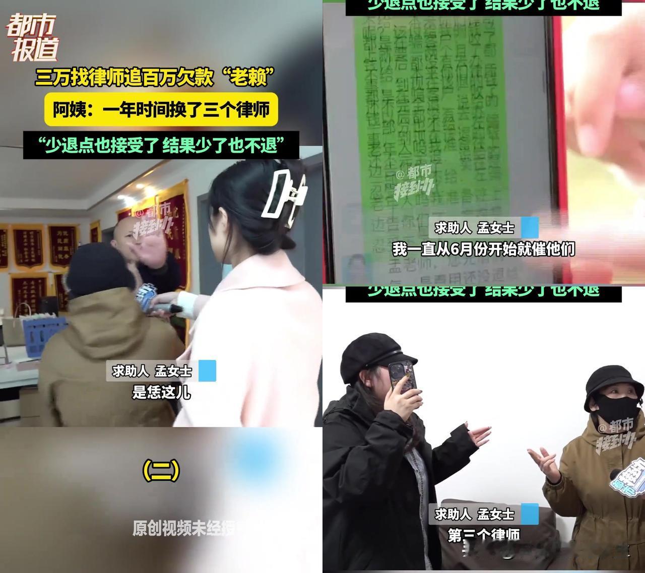 比老赖坑人还寒心!孟阿姨这遭遇我看了直难受! 攒了一辈子的100万被老赖卷走,哭着花三万找律师讨公道。 结果等了一年,换了三个律师,分没要回来就算了。 阿姨说:“去年12月交的钱,我求着少退点,人家都不理!” 有人说自己被律师骗一万,电话都不接。 还有人说律师就交个材料,直接挣一万。 最让人揪心的是阿姨那副低头的样子,她本来是受害者啊! 老赖坑的是钱,律师坑的是对专业的信任! 你有没有遇过想找帮忙反而被坑的事?比如找装修、找中介?