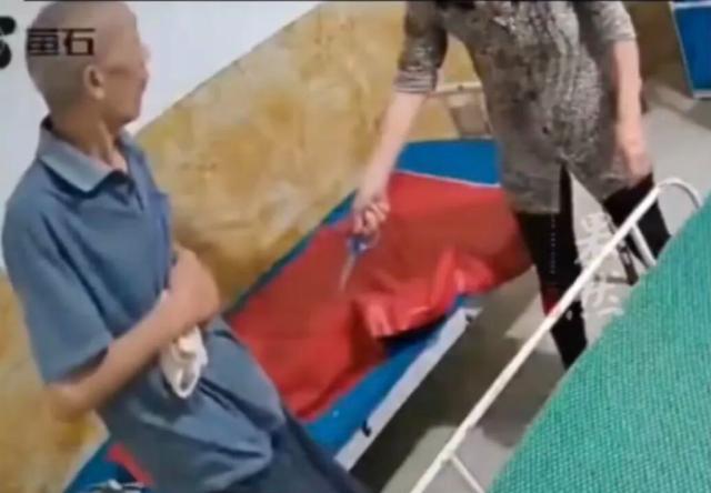 黑龙江,一家托老所内,一位老人正乖乖的站在床边,但是他的行为好像没有获得女护工满